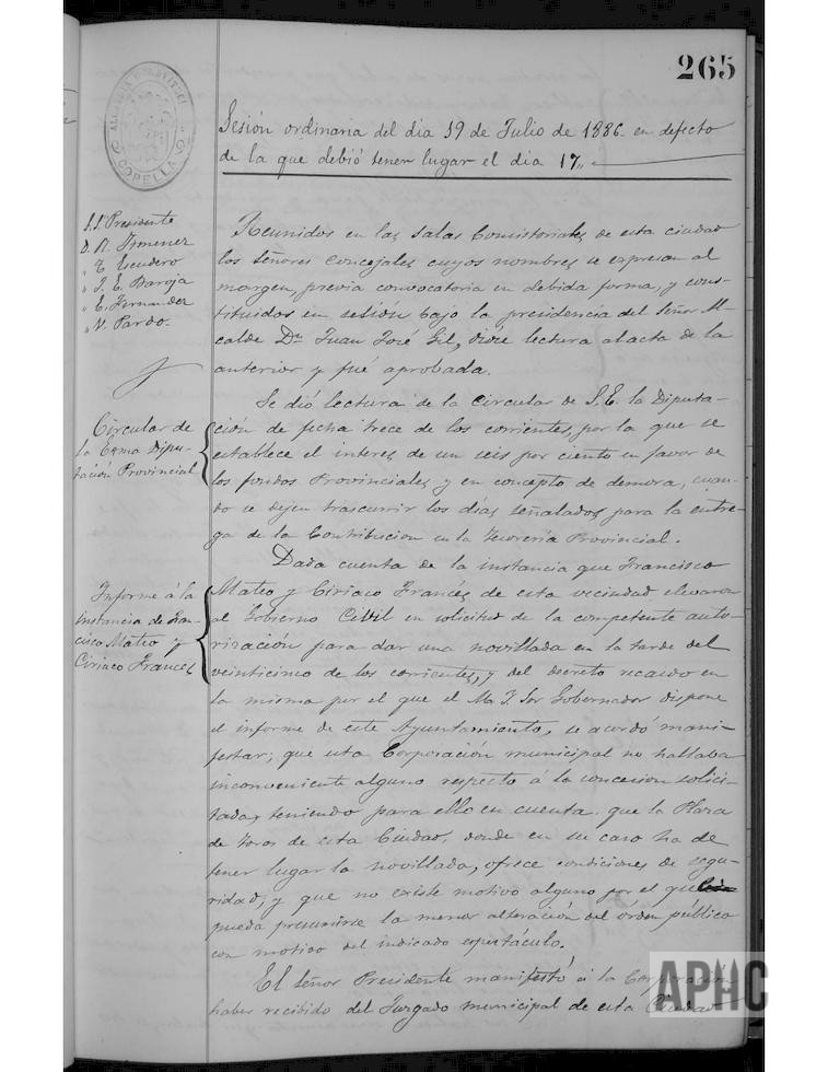 Francisco Mateo y Ciriaco Francés, solicitan autorización para celebrar una novillada el día 25; el Ayuntamiento accede a dicha celebración. Sobre juicio contra Mariano Alcázar, por corta de árbol del paseo público. El Depositario anterior Manuel Jiménez, presenta cuentas que, conformes, pasan al Depositario electo Teodoro Fuertes.