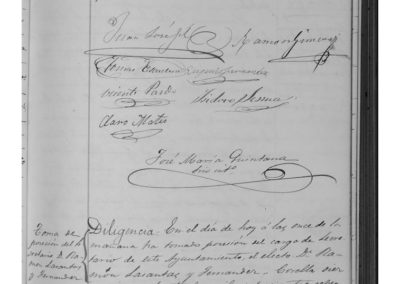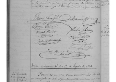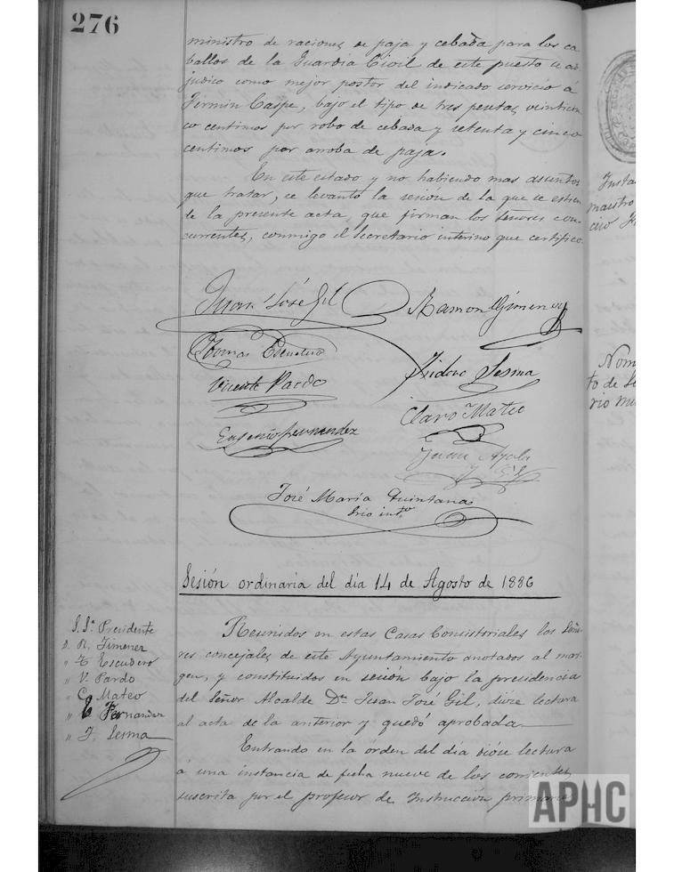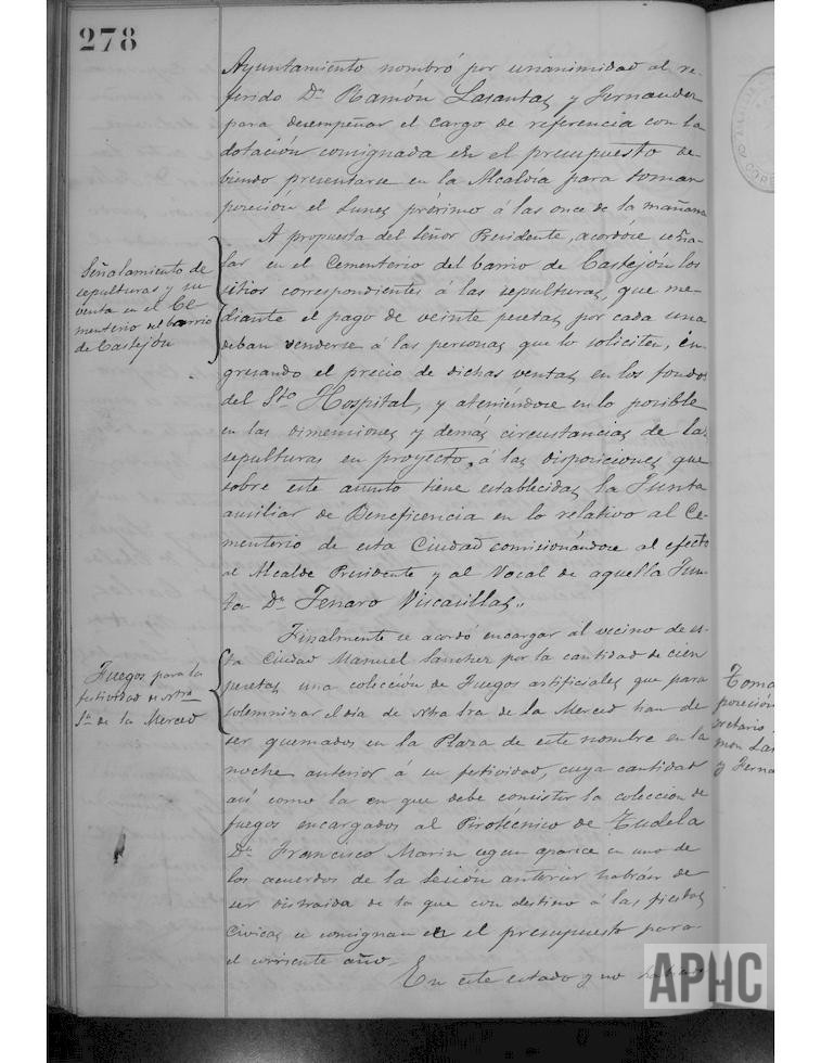 El maestro Narciso Felipe, solicita solicitud para ausentarse provisionalmente, y se le autoriza, delegando las funciones en el maestro Félix Rodríguez Palacio. Vistas las instancias presentadas para el cargo de Secretario de este Ayuntamiento, se acordó el nombramiento de Secretario para la Corporación de Ramón Lasantas Fernández, vecino de esta Ciudad. Se autoriza la venta de terrenos para sepulturas en el cementerio de Castejón. Se encargan al vecino Manuel Sánchez, los fuegos artificiales para solemnizar el día de Ntra. Sra. de la Merced, siendo quemados en la víspera de dicha festividad, en dicha Plaza. A continuación de esta acta, hay una Diligencia para hacer constar que el día 16 de agosto de 1886, toma posesión de su cargo de Secretario del Ayuntamiento, Ramón Lasantas.