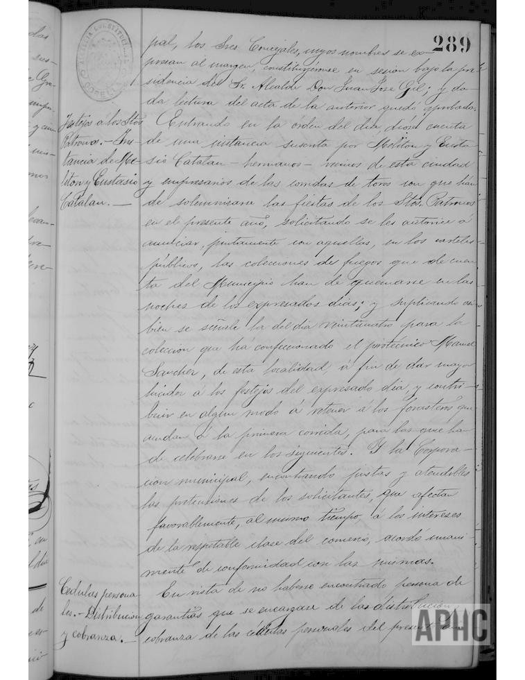 Solicitud de Melitón y Eustasio Catalán, empresarios de las corridas de toros para las fiestas patronales, para anunciarse conjuntamente en los actos del Ayuntamiento en los carteles públicos; se accede a lo solicitado. Alguacil Mariano Mateo, Pregonero Eusebio Fernández. Dimisión, por motivos de salud, del alguacil León Navarro, se acuerda nombrar de forma interina, para dicho cargo, al alguacil del Juzgado Juan Cruz Caspe, y anunciar la vacante. Se nombra a Severino Jiménez administrador para el cobro del impuesto por la introducción de uvas de fuera del municipio. Toma de posesión del nuevo Maestro Félix Rodríguez, por la Escuela de Ntra. Sra. del Rosario, en sustitución de Narciso Felipe.