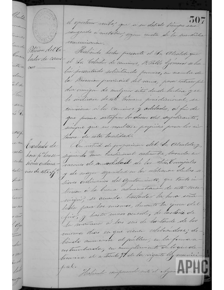 Se autoriza al Celador de Caminos de la Excma. Diputación, Pablo Gómara, para extracción de piedra. Se traslada la hora de la celebración de las sesiones municipales ordinarias, durante los meses de frío, de las 10 de la mañana a las 6 de la tarde, de los mismos días. Es cabo de Guardas Valentín Bermejo. Denuncia del Guarda Pedro Mateo Jiménez, contra Hipólito Ortega, por llevar a pastar ganado de su padre residente en Alfaro al término municipal corellano, no teniendo derecho y omitiendo el impuesto de matanza de reses ajenas al municipio. Abono a Tiburcio García por pintura de tres lienzos para el Santo Hospital y al Alguacil Mariano Mateo por adquisiciones con destino al vestuario.