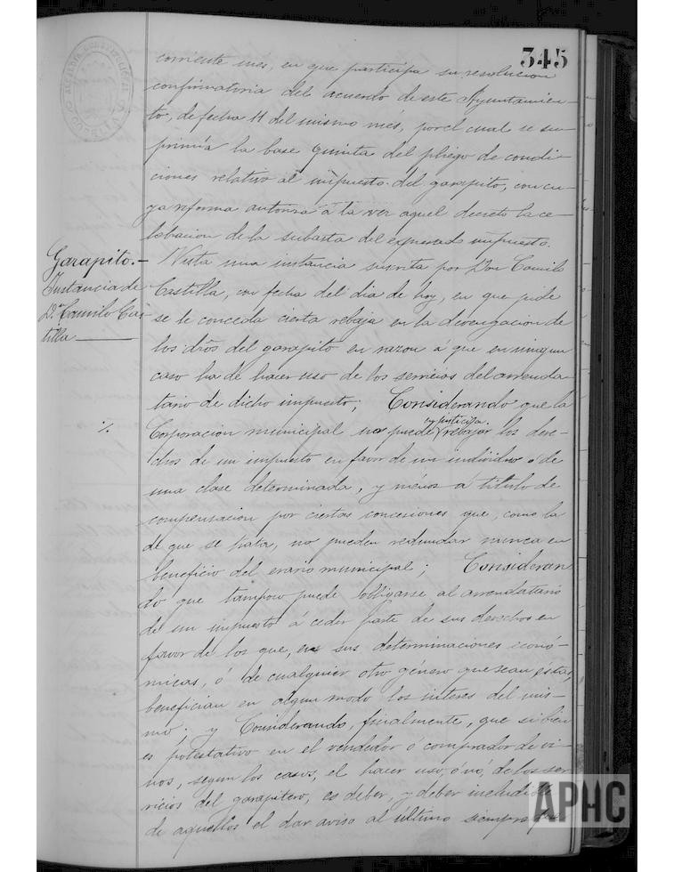 Denegando a Camilo Castilla, solicitud de rebaja del impuesto de garapito. Solicitud de Pascual Oteiza, de copia de acuerdo municipal, prohibiendo la entrada del matarife Atanasio Andueza, al Matadero municipal.
