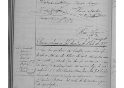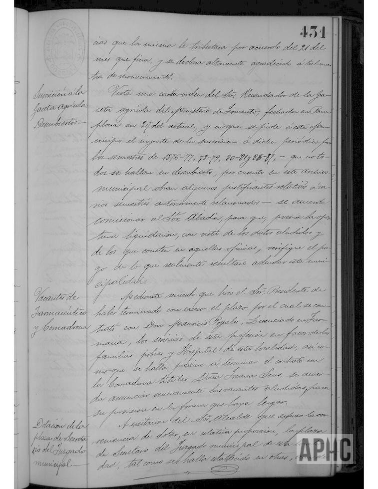 Finalizado plazo de contrato para atención a familias pobres y Hospital, del Farmacéutico Mauricio Poyales y Comadrona Juana Sens, se acuerda anunciar las vacantes aludidas. Tasación y venta a Dionisio Sánchez, terreno sobrante del camino de Bardón. Nombramiento por sorteo entre los solicitantes Gabino Grávalos, Juan Atienza, Fernando Atienza y Felipe Atienza, para la plaza de Guarda del Paseo público y encargado de la limpieza de las fuentes del “Buen Deseo”, Bardón y del lavadero público, siendo elegido para el cargo Felipe Atienza.
