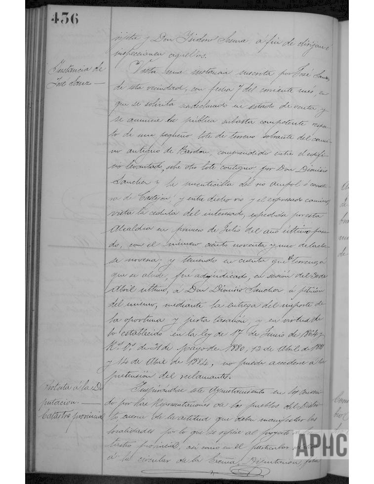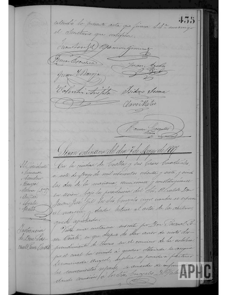 Instancia de Pascual Pérez Oñate, para arreglo de la acequia de Ampol, obstruida por un desprendimiento de terreno en el llamado camino de la arboleda. Adjudicación definitiva de terrenos sobrantes del antiguo camino de Santa Ana a los solicitantes Manuel Jiménez Ayala y Manuel Campos Librada, a cada uno la parte por ellos interesada y al nuevo precio tasado.