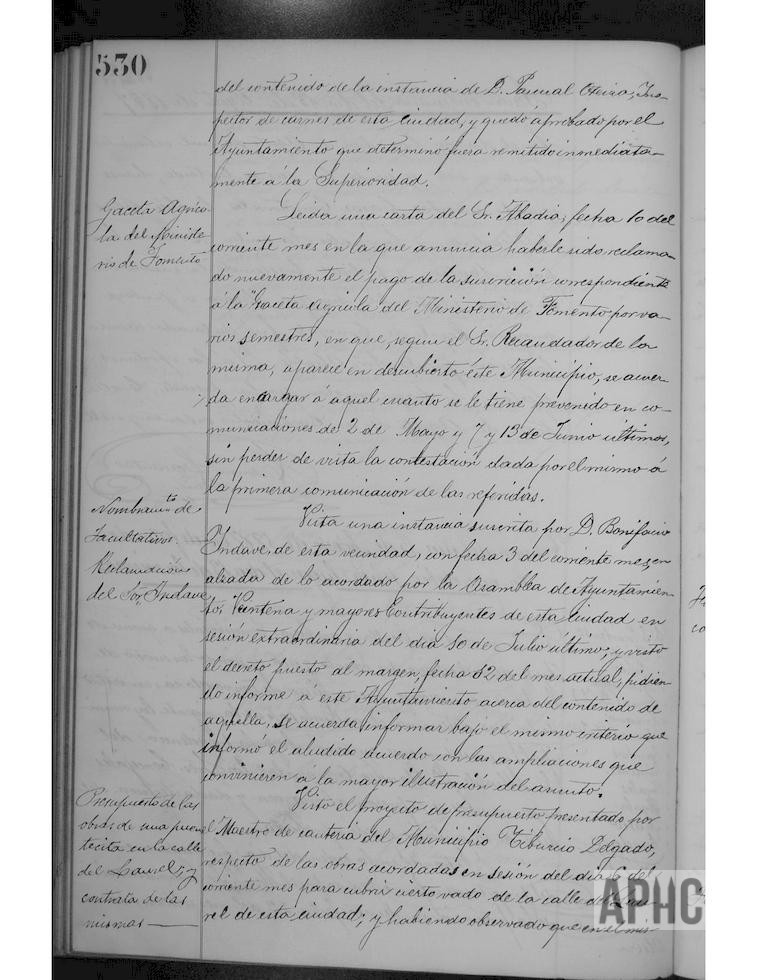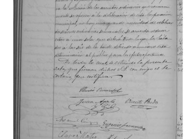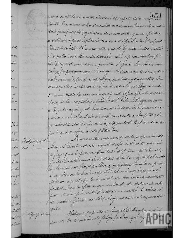 Se aprueba presupuesto del maestro cantero Tiburcio Delgado, para construcción de una puente en la calle Laurel. Se contratan con Manuel Sánchez, fuegos artificiales para las próximas fiestas patronales. Por las consideraciones reflejadas en el acta, se acuerda celebrar únicamente una sesión ordinaria a la semana, celebrándose los sábados a las 6 de la tarde.