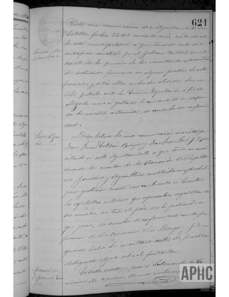 Comunicación del Ayuntamiento de Estella, sobre el contrafuero del Gobierno Central en cuanto a la provisión de las vacantes de Maestros de Instrucción Primaria. Se comunica a la Excma. Diputación defienda nuestra autonomía. Instancia de Manuel Campos, en solicitud de paso a finca de Manuela Librada, finca situada en el Prado Concejil, para que sus vacas puedan pastar las yerbas de dicha finca que ha comprado a su propietaria. Autorizando arreglos en salones de la Fonda de Castejón para el acto de celebración de la inauguración de las obras del ferrocarril Castejón-Baños de Fitero; acto financiado por Donato Gómez Trevijano.