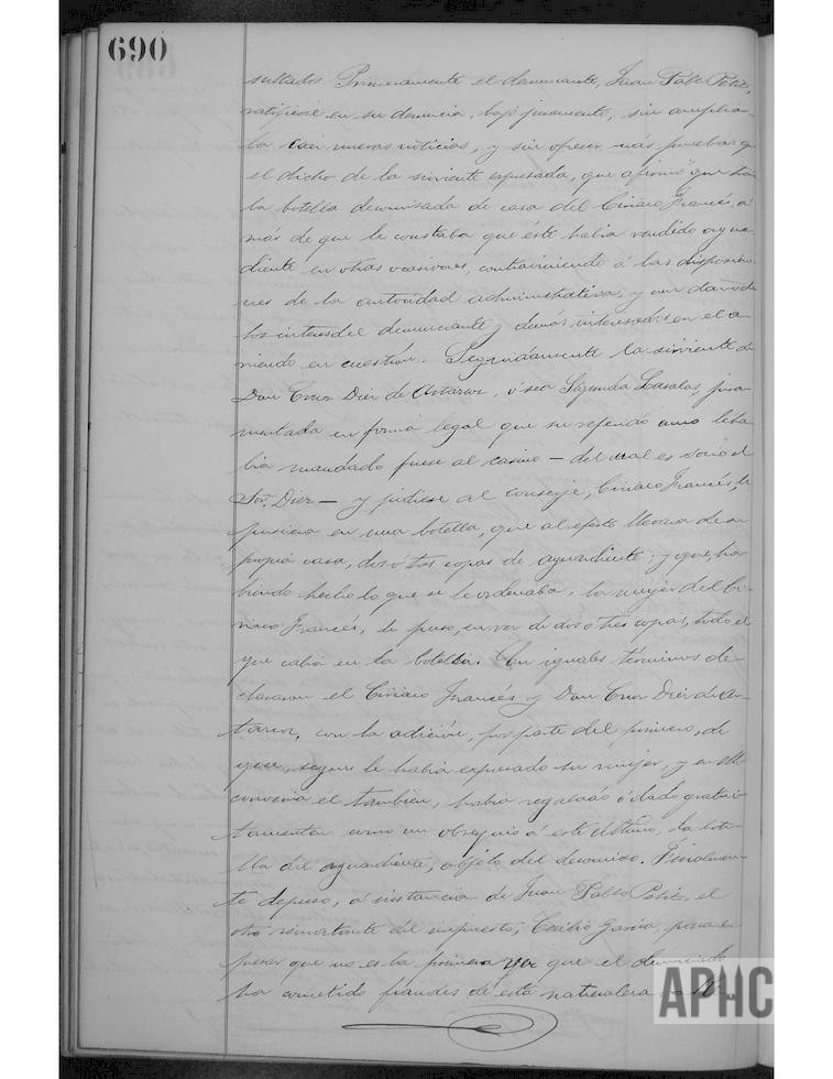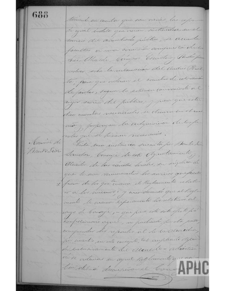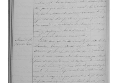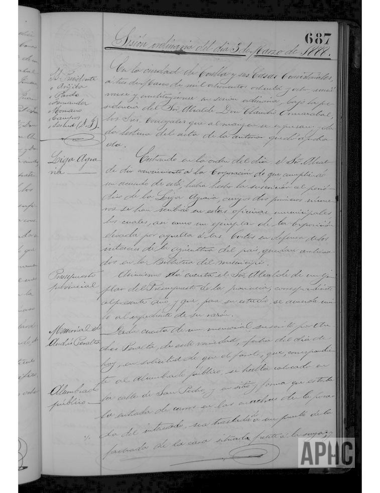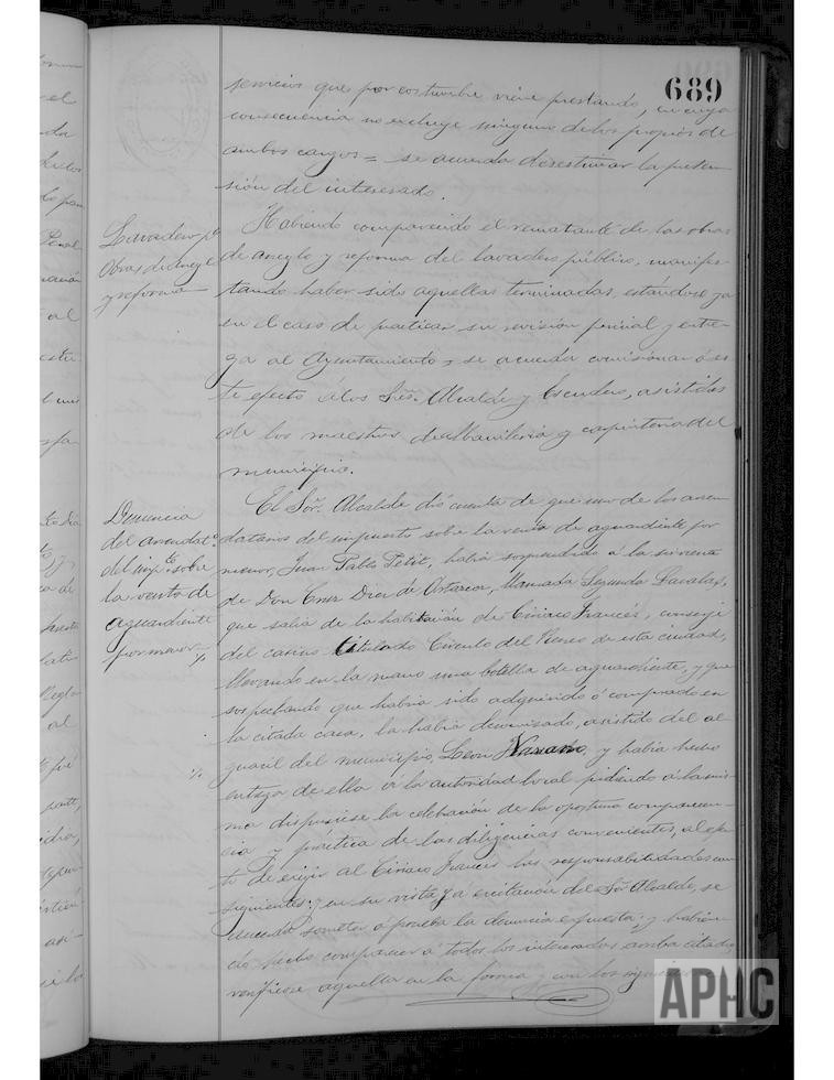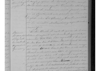 Solicitud de Andrés Peralta sobre molestias causadas por un farol del alumbrado público en la calle de San Pedro, para entrada de carros a la posada del solicitante; se acuerda pase a estudio, junto con otras reclamaciones en el mismo sentido. Finalización de las obras de cerramiento del lavadero público. Juan Pablo Petit, es arrendatario del impuesto de venta de aguardiente al por menor. Multa a Ciriaco Francés, conserje del casino titulado “Círculo del Recreo”, por venta de aguardiente al por menor.