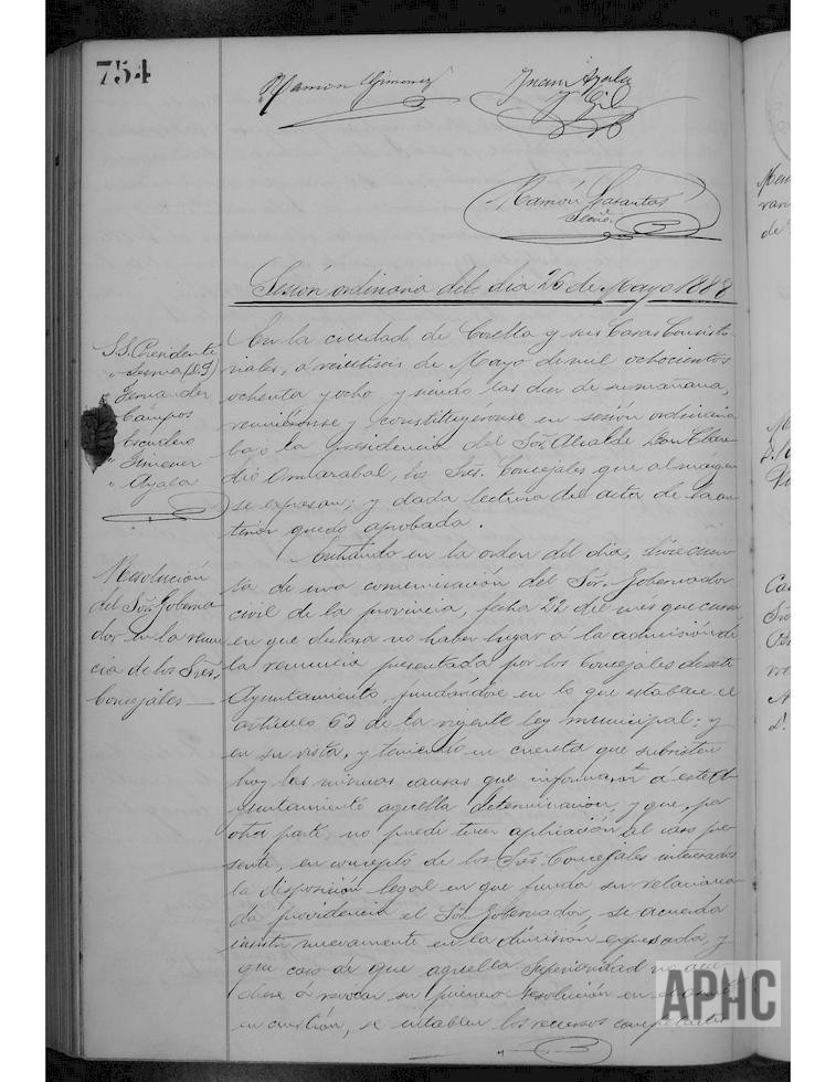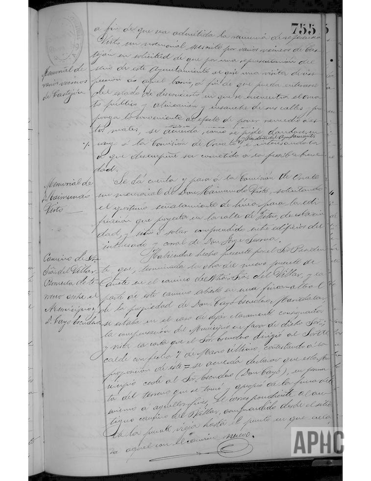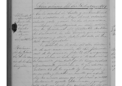 Resolución del Gobernador Civil sobre no haber lugar a la admisión de la dimisión de los Concejales del Ayuntamiento de Corella. Se acuerda entablar los recursos oportunos a fin de que sea admitida dicha renuncia. Escrito de varios vecinos de Castejón, informando del desconcierto existente en las edificaciones que se están llevando a cabo; se acuerda visita de la Comisión de Ornato para buscar una solución al problema. Solicitud de Raimundo Virto, para el oportuno señalamiento de línea, para la edificación que proyecta realizar en la calle Fitero, junto a corral de Jorge Sesma. Finalizada la nueva puente de Cañete en el camino de Ntra. Sra. del Villar y habiendo sido necesario tomar parte de finca de Cayo Escudero Marichalar, se conforma una permuta de terreno con Sr. Escudero en el mismo término. (¿Esta puente puede ser la que está próxima a la Basílica y que en algún momento se indica se denomina de “La Verónica”?). Carlos Moreno, es Notario.