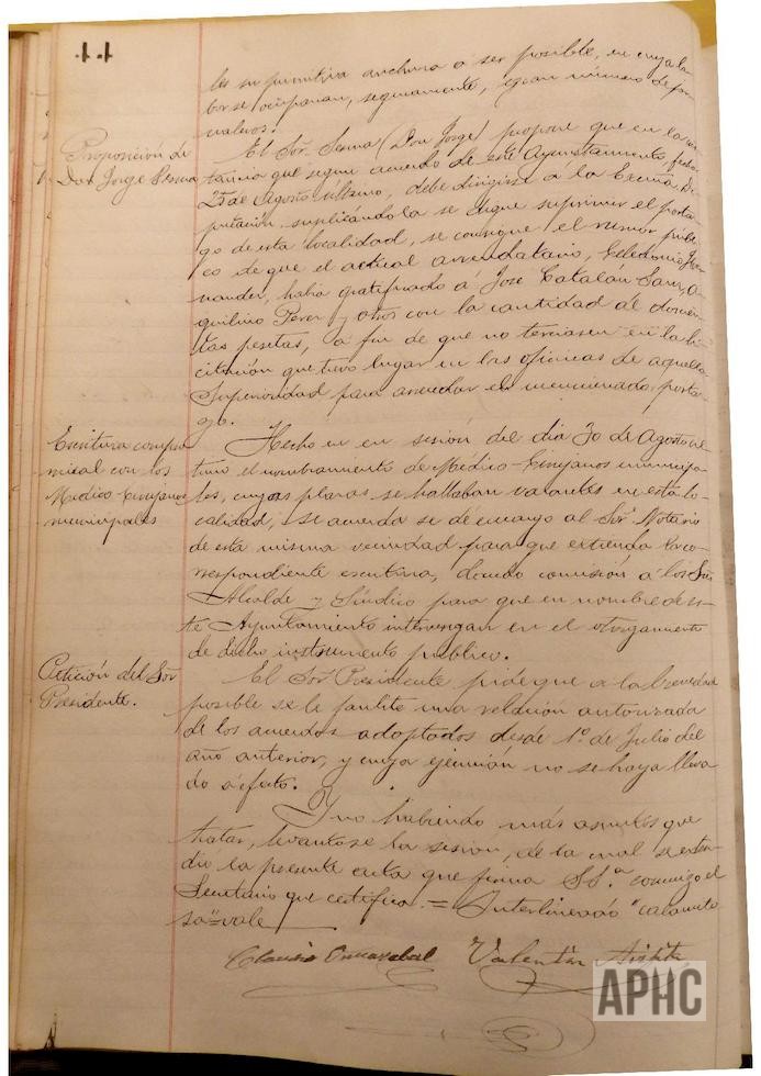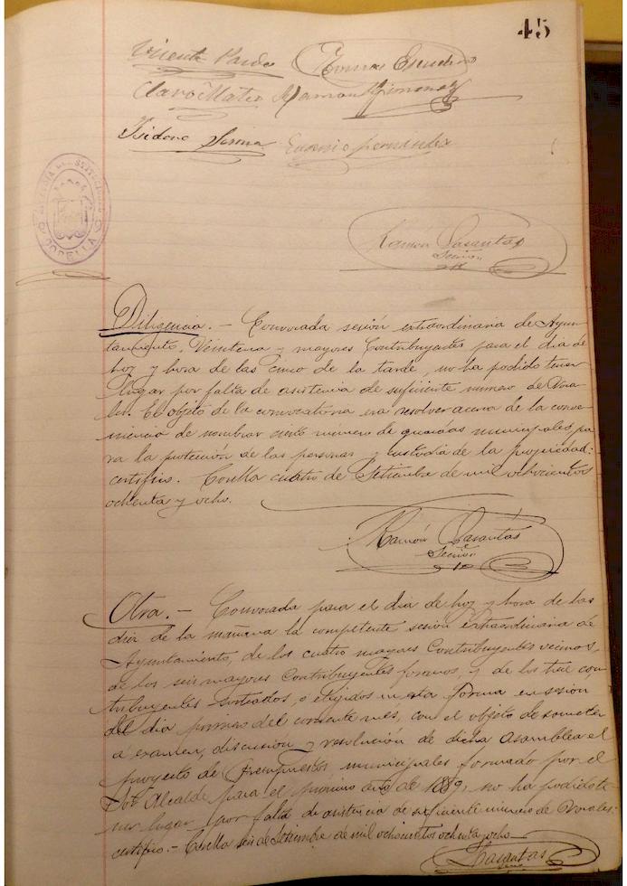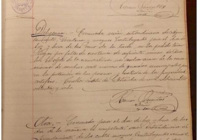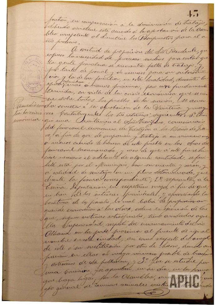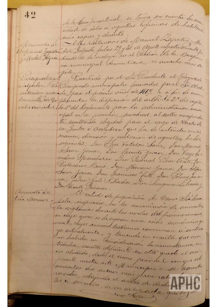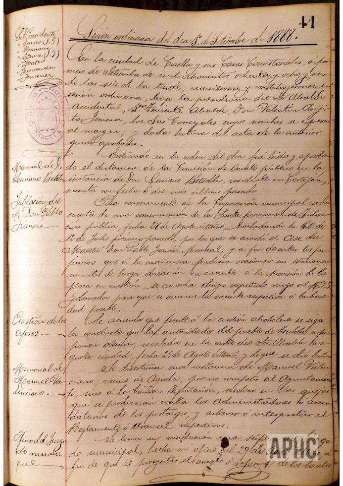 Se informa de comunicación de la Junta Provincial de Instrucción Pública, trasladando Real Orden por la que se acuerda el cese del Maestro Pablo Francés Monreal; y se acuerda solicitar el Sr. Gobernador el anuncio, lo antes posible, de dicha vacante.- Presentado el Proyecto de Presupuestos para el año 1889, de conformidad con lo dispuesto en el Reglamento de la Administración Municipal de la Provincia, se procedió al sorteo de Vocales de la Junta o Asamblea que ha de entender e intervenir en el examen, discusión y resolución de dichos Presupuestos, resultando elegidos José Catalán Sanz, Manuel Sanz Gómez, Benito Gómez, Cayo Escudero Marichalar, Pascual Pérez Oñate, Victoriano Bisié, Mariano García, Esteban Sanz Gómez, Francisco Virto, Polonio Jiménez, Galo Librada, Longinos Librada y Vicente Jiménez.- Por las consideraciones expuestas en el acta, se acuerda aumentar dos Serenos más y 1 Cabo, hasta nueva orden, rebajando el sueldo a 6 reales en lugar de los 7 reales que hoy disfrutan, en compensación a la discriminación de trabajo.- En atención a la crisis económica nacional existente, y por lo que respecta a esta Ciudad, se acuerda dirigirse al Sr. Trevijano (Donato Gómez Trevijano), para que en los trabajos del Ferrocarril Castejón a los Baños de Fitero, del que es concesionario, emplee a un número relevante de trabajadores de esta Ciudad, y caso de ser necesario realizar adelanto de alguna cantidad, se realice por el Ayuntamiento, en calidad de reintegro en un plazo determinado mediante la fianza correspondiente. Igualmente, solicitar a la Excma. Diputación que, por las noticias que se tienen y ante la situación existente, proceda a la realización de las obras de encauzamiento del río Alhama, en las proximidades del puente, así como el arreglo de dicho puente o su sustitución por otro de hierro, dando ocupación a un número importante de braceros y artesanos de esta Población. Igualmente, se acuerda se estudie por una Comisión y posteriormente se apruebe en la Asamblea, una reforma o arreglo general de caminos vecinales, para que vuelvan a su primitiva anchura, ocupando un buen número de jornaleros de la Ciudad.
