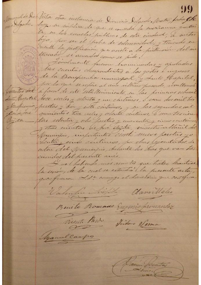 Vista la solicitud del Juez Municipal, se acuerda facilitar un brasero para dicha Oficina.(Había que calentar la oficina de alguna forma).- Atendiendo solicitud de Clemente Arnedo y consortes, se acuerda el arreglo de la cuesta que va de la Plaza Baja a la calle de “La Conejera”.- Fueron examinadas y aprobadas las cuentas de gastos e ingresos de la Beneficencia Municipal y del Santo Hospital, relativas a este año último, resultando un saldo favorable a dichas entidades de 8.012,71 reales, es decir 2.003,17 pesetas en Beneficencia y 1.513,80 reales, es decir 378,45 pesetas, en las del Hospital.