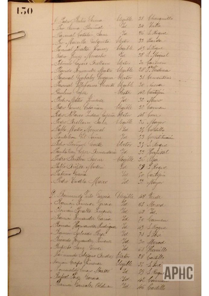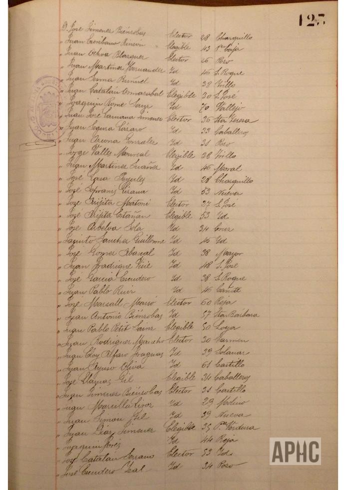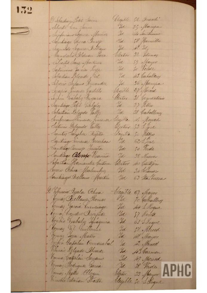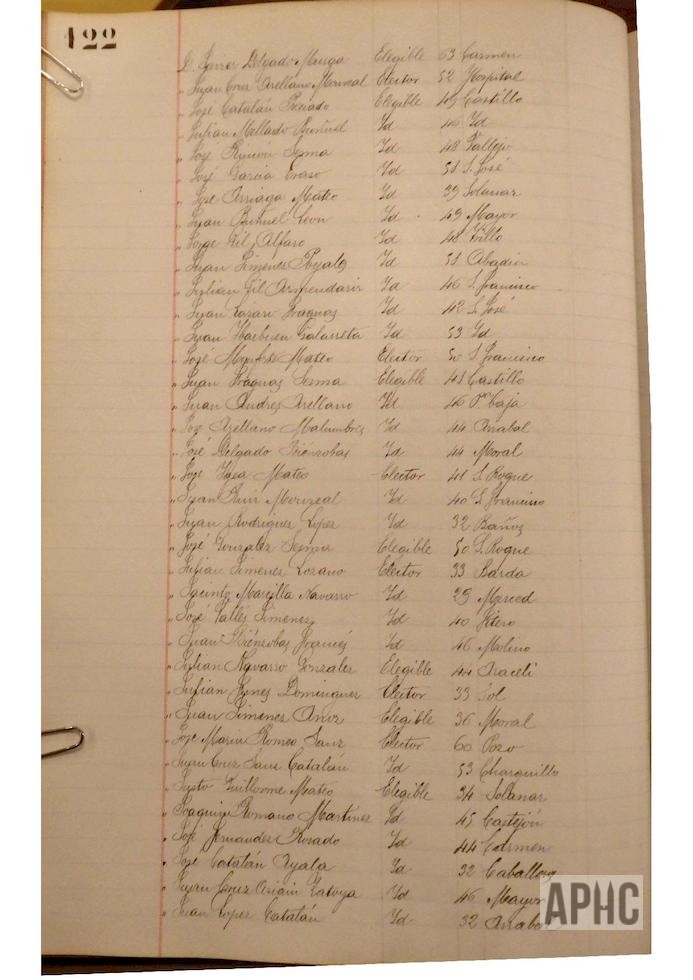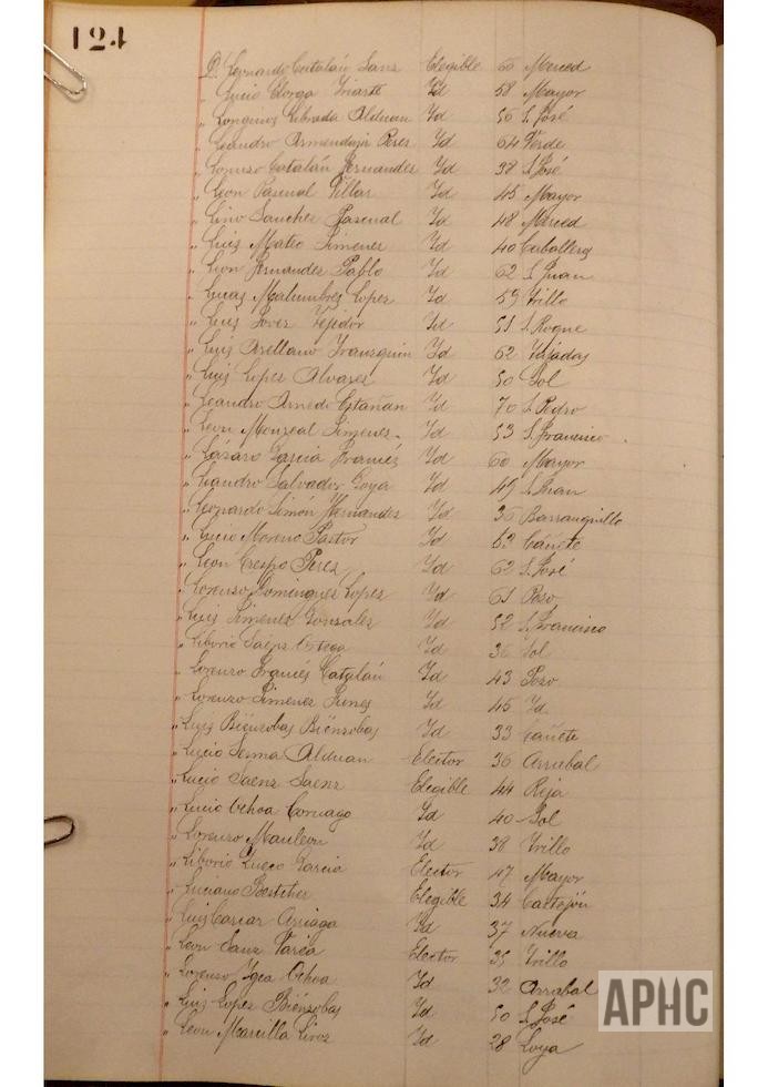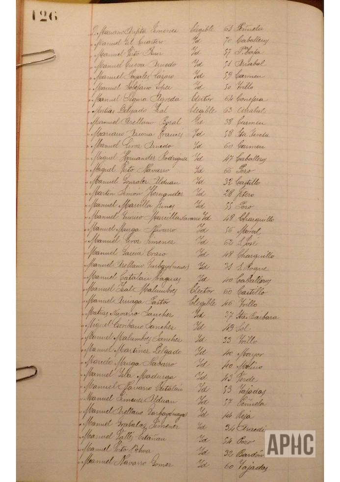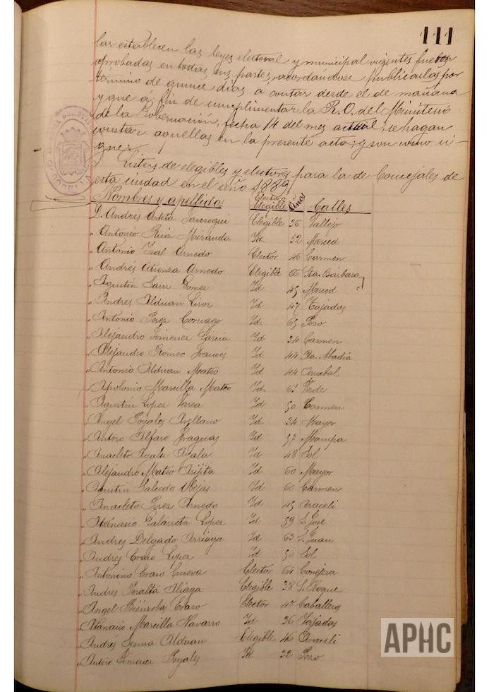 Se deja constancia en acta, de la lista de electores y elegibles para Concejales del Ayuntamiento, figurando la siguiente relación, que se transcribe, por los datos de interés que aporta, pues puede considerarse un Censo de cabezas de familia de ese año: