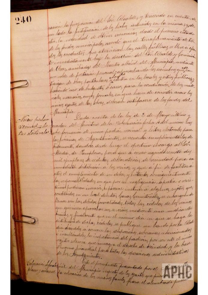 En cumplimiento de disposición sobre formación de nuevo padrón vecinal y listas electorales para las próximas de Ayuntamiento, se acuerda obtener en Pamplona 2.000 ejemplares de cédulas declaratorias de vecindad, para su distribución a los vecinos, y con el fin de que puedan cumplimentarse correctamente, se dispondrá de varios sujetos que, en un local de la Casa Consistorial, se encarguen de cumplimentar dichas cédulas, a los vecinos que lo deseen, mediante una módica retribución, y que se publique bando antes del oportuno reparto de dichas cédulas, informando de la importancia de los padrones.- Se dispone la colocación de faroles y placas de nombres de calles, a cuenta del Ayuntamiento, por el maestro albañil, lo antes posible, y que se publique bando invitando a los propietarios interesados en la reforma de la numeración, para que se hagan cargo de los números que corresponden a sus casas, abonando su importe, con la advertencia de que transcurridos 3 días, sin haber recogido dichos números, se entenderá renuncian al derecho de colocarlos ellos mismos, y se realizará por el Municipio, a costa de los mismos.- A petición de varios concejales, se acuerda el traslado de la hora de las sesiones ordinarias, que ahora se celebrarán los sábados a las 6 de la tarde.