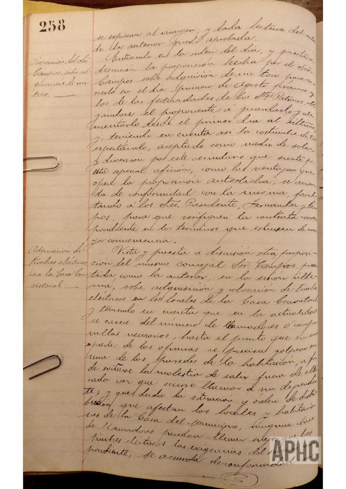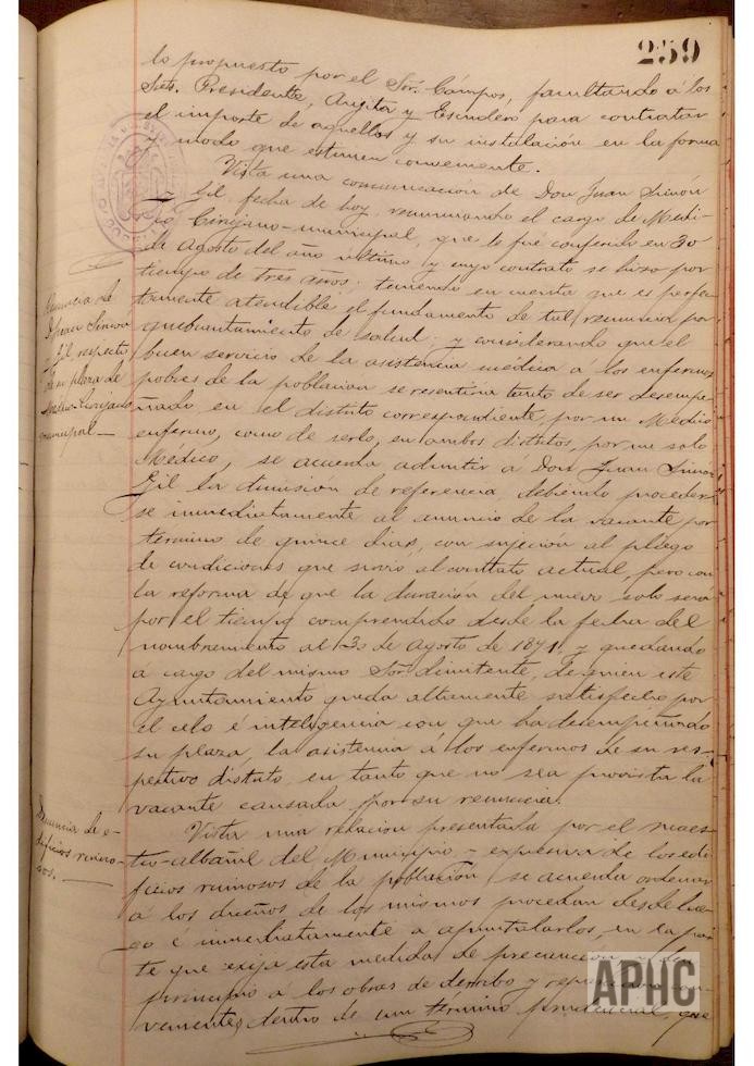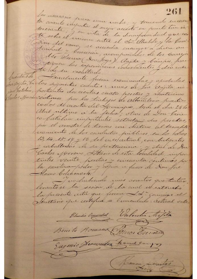 Se acepta la proposición del Concejal Sr. Campos, para compra de un toro, por parte del Ayuntamiento, por existir una ocasión, con el fin de correrlo con soga por las calles, el primero de Agosto y en las fiestas patronales, comprometiéndose dicho Concejal a alimentarlo, entre ambas fechas, a sus expensas y se faculta al Sr. Alcalde, Secretario y dicho Sr. Campos, para la contrata correspondiente. – Se acepta igualmente, la proposición del Concejal Sr. Campos, para adquisición e instalación de timbres eléctricos, para las oficinas de la Casa Consistorial, y se faculta a los señores Alcalde, Arigita y Escudero, para su tratar su compra e instalación.- Vista solicitud del Médico-Cirujano municipal, Juan Simón Gil, presentando su renuncia al cargo por motivos de salud, se acuerda aceptar su renuncia y anunciar dicha vacante. (Carlos Moreno Escribano, es notario de Corella).