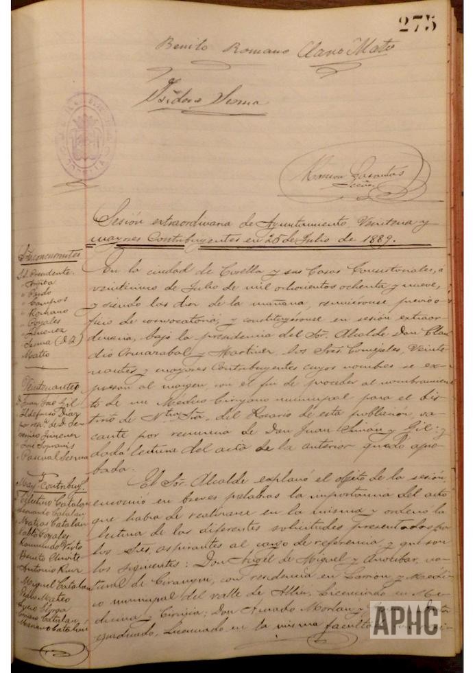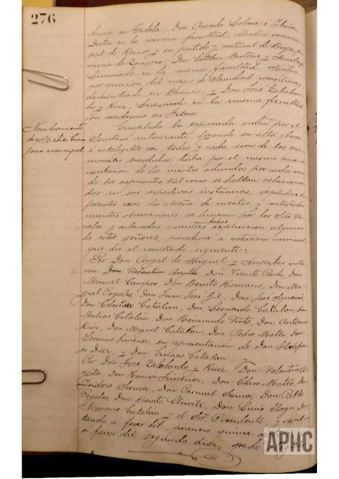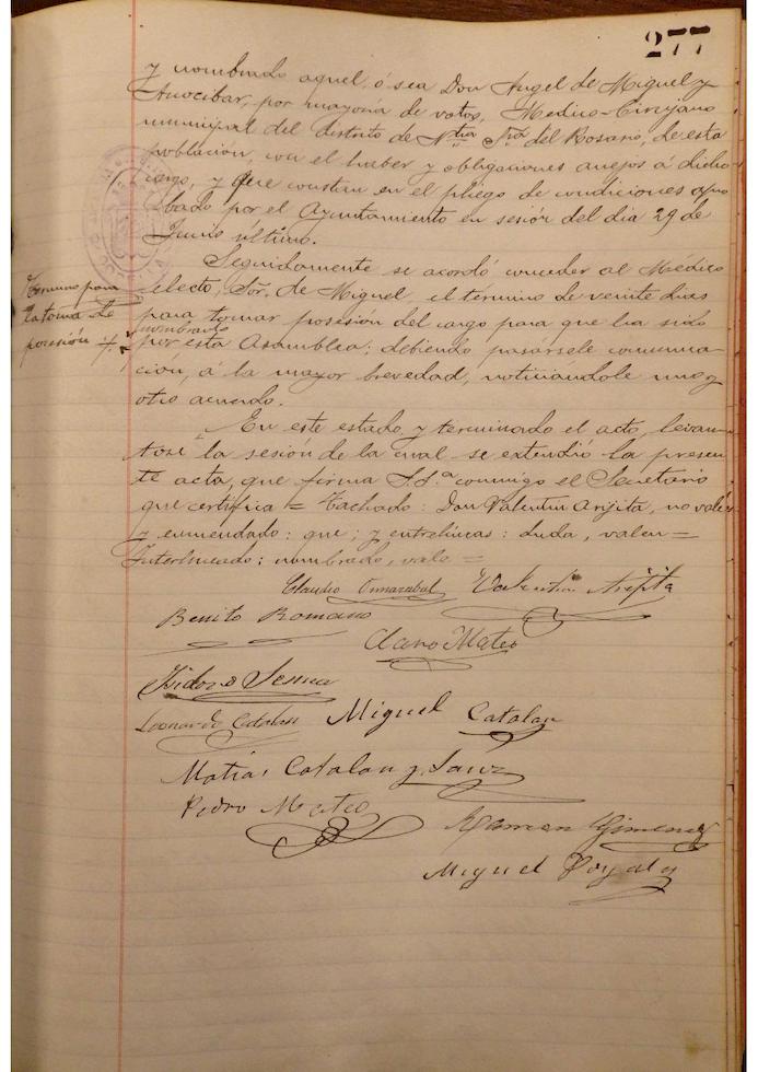 Reunidos Ayuntamiento, Veintena y Mayores Contribuyentes, se informa de las solicitudes presentadas para cubrir la vacante de Médico-Cirujano del distrito de Ntra. Sra. del Rosario, ocasionada por renuncia del titular Juan Simón Gil, y vistos los memoriales de los aspirantes, se sometieron a votación, resultando el más votado, por cuyo motivo fue nombrado Médico-Cirujano municipal del distrito de Ntra. Sra. del Rosario, Ángel de Miguel Anocibar, natural de Cirauqui, con residencia en Larrión y Médico municipal del valle de Allín, al que se le concedió un plazo de 20 días para su toma de posesión del cargo.