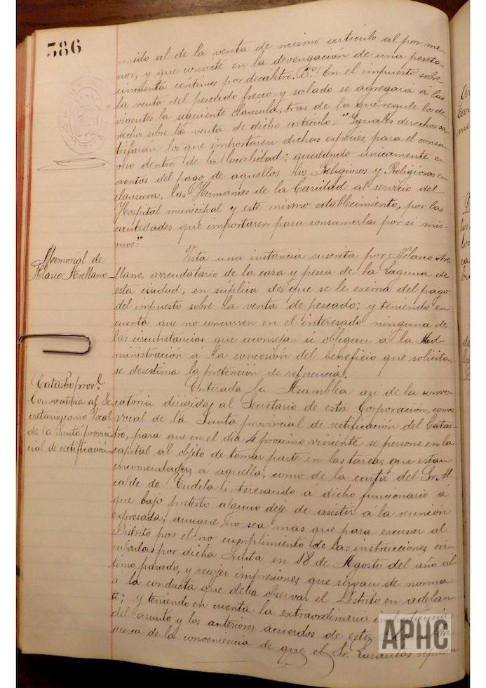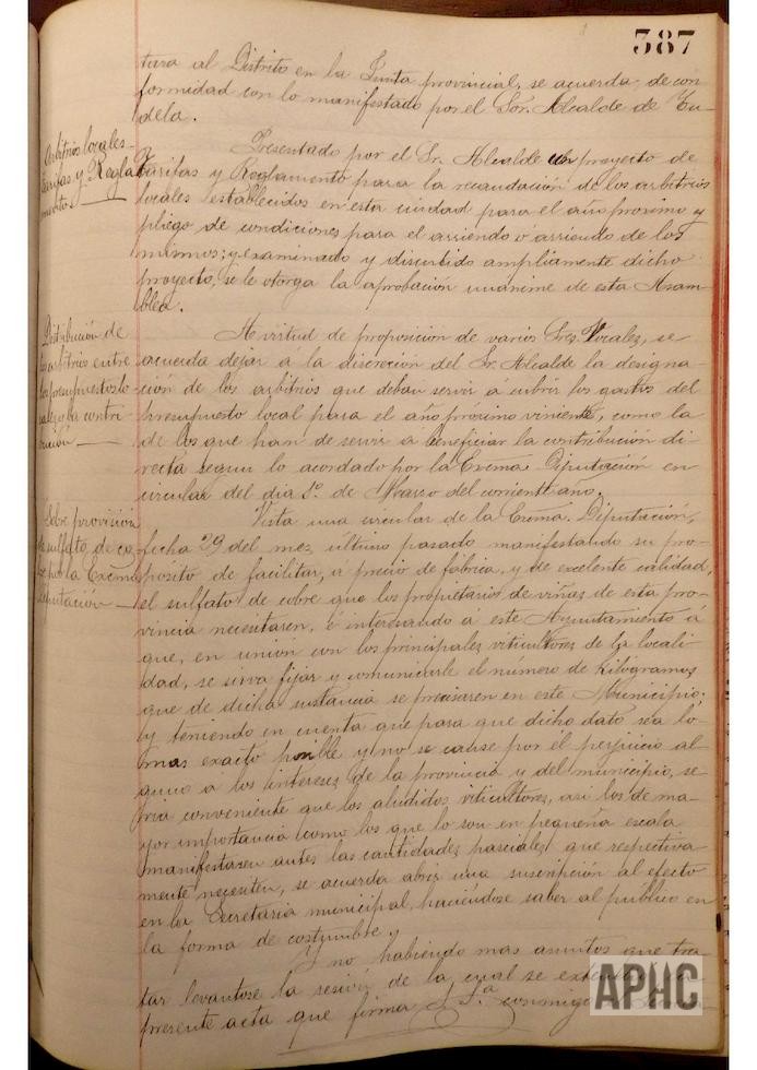 Reunidos Ayuntamiento, Veintena y Mayores Contribuyentes, en sesión extraordinaria, entre otros asuntos, se informa de la solicitud de Nolasco Arellano, arrendatario de la caza y pesca de La Laguna de esta Ciudad (“La Estanca”), para que se le exima del pago del impuesto sobre la venta de pescado, siendo denegada dicha solicitud. Se informa de Circular de la Excma. Diputación, comunicando dispone a precio de fábrica de sulfato de cobre, para combatir el mildiu de la vid y se acuerda contactar con los viticultores corellanos para estimar la cantidad que se precisaría, facilitando una suscripción en la Secretaría, a fin de realizar dicha petición.