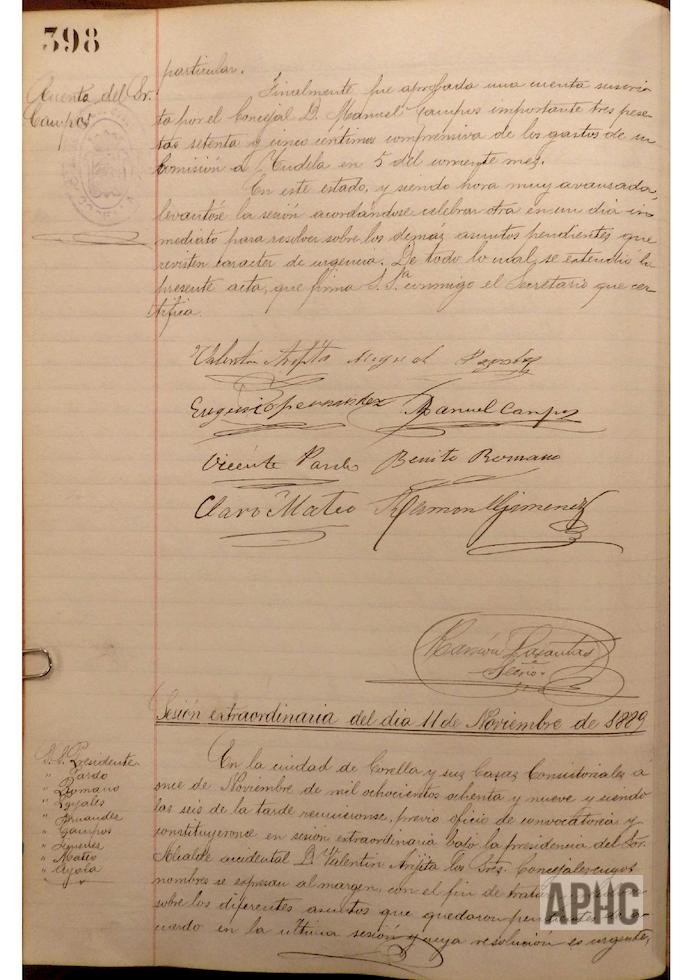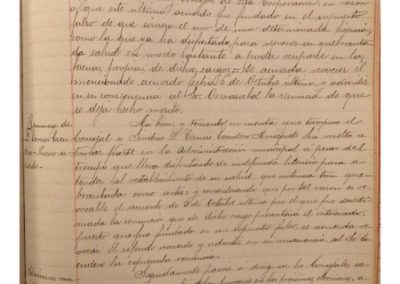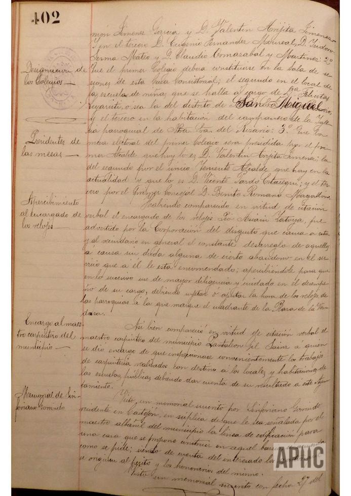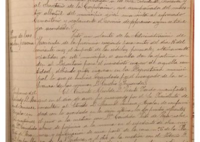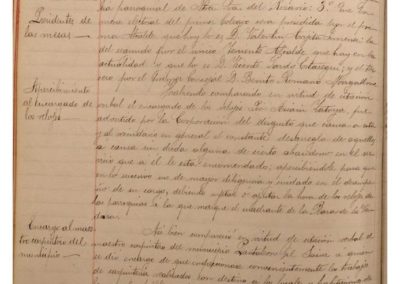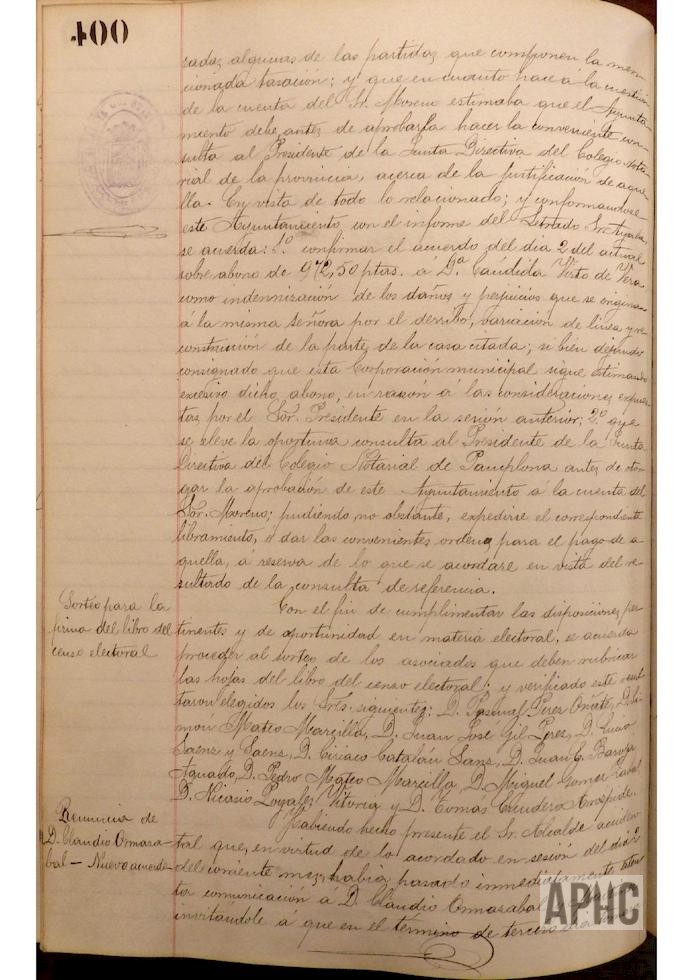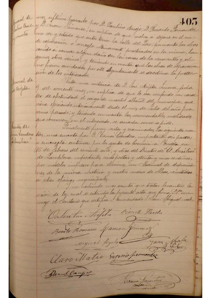 Se informa sobre circunstancias en el cementerio de Castejón y se acuerda encargar a los señores Presidente, Jiménez, y Secretario de la Corporación, acompañados del maestro albañil del Municipio, para que giren visita a dicho cementerio. Se informa sobre no contestación de requerimiento realizado a Claudio Ormazábal, sobre su incorporación a la alcaldía y no habiendo tenido contestación alguna, se acuerda tomar en consideración y aceptar su renuncia presentada con anterioridad al cargo de Concejal y Alcalde de la Ciudad. Se acuerda admitir la renuncia al cargo de Concejal, presentada anteriormente de Tomás Escudero, anulando acuerdo por el que se desestimaba dicha renuncia. Se designa a los Concejales salientes, cuyas vacantes deben proveerse en las próximas elecciones municipales, cesando en sus cargos Claro Mateo Salvador, Juan Ayala Gil, Tomás Escudero Arróspide, Jorge Sesma Romeo, Ramón Jiménez García, Valentín Arigita Jiménez, Eugenio Fernández Monreal, Isidoro Sesma Mateo y Claudio Ormazábal Martínez. Se designan los colegios electorales, constituyéndose el Primero en la sala de sesiones de esta casa Consistorial, el 2º en el local de la escuela de niñas que está a cargo de Felicitas Leyaristi, o sea el del distrito de San Miguel, y el 3º en la vivienda del campanero de la parroquia de Ntra. Sra. del Rosario, presidiendo las mesas del primer colegio electoral por el primer alcalde Valentín Arigita, la del 2º, por el teniente del alcalde Vicente Pardo Estaregui, y la del 3º por Benito Romano Magallón. Se hace comparecer el encargado de los relojes Pío Asiain Zatoya, y se le apercibe del disgusto de los vecinos y del Ayuntamiento por el desajuste y mal funcionamiento de los mismos y se le advierte que la hora de los relojes de las parroquias se deben ajustar a la que marque el cuadrante de la Plaza de la Verdura. Atendiendo su solicitud y vistas sus recomendables cualidades, se designa para el cargo de maestro albañil a José Arigita Jiménez, que venía desempeñándolo de forma interina.