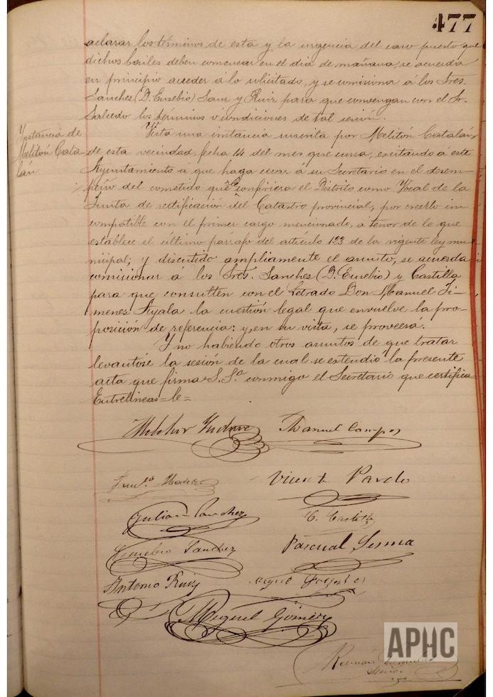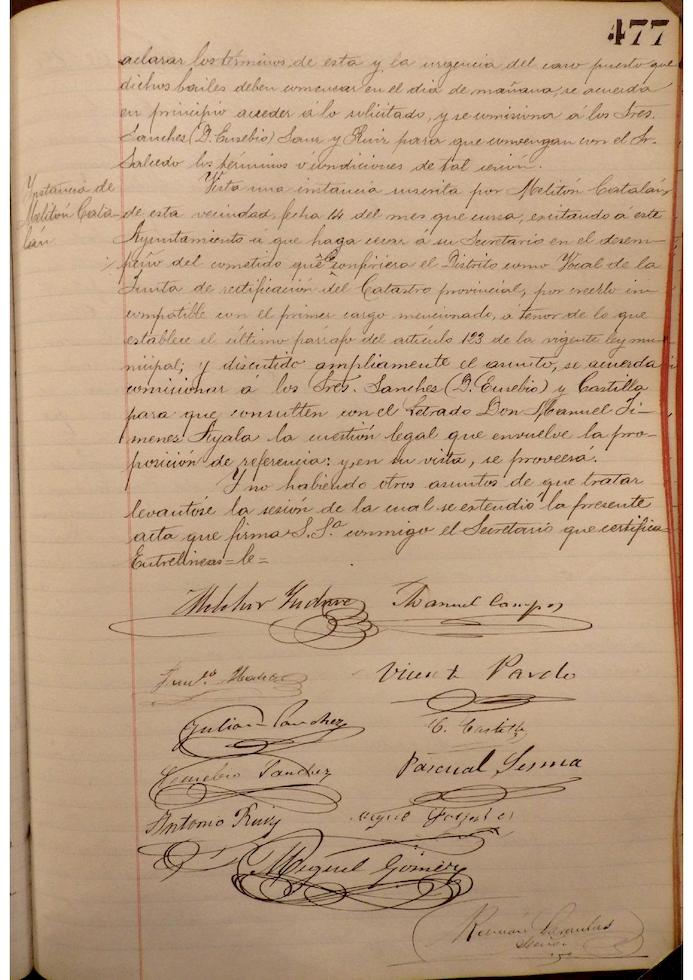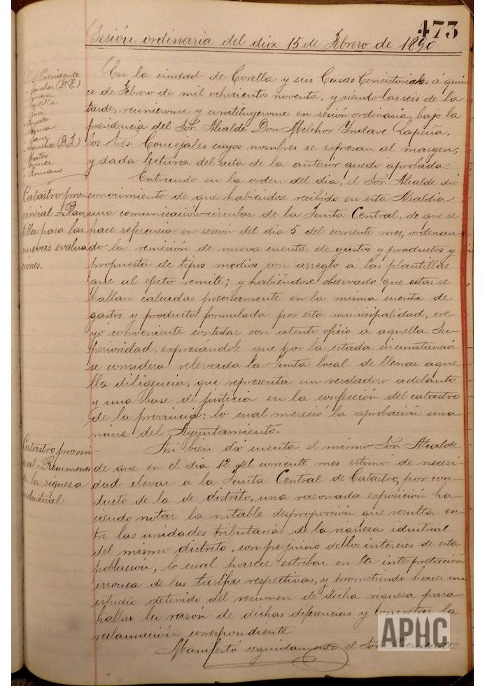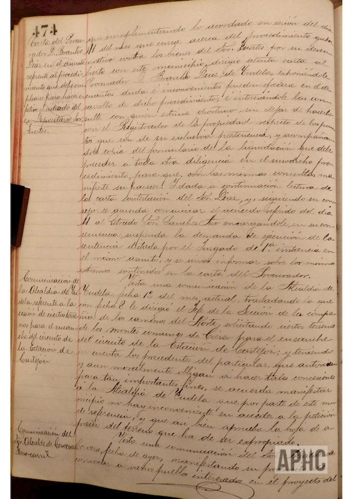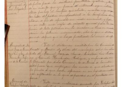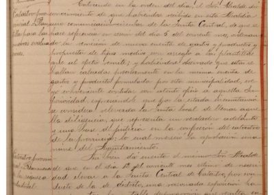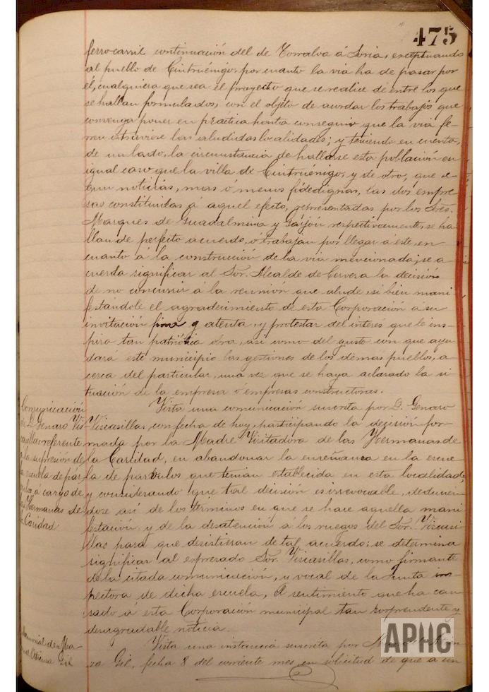 Visto escrito del Alcalde de Cervera, sobre reunión de diversas poblaciones interesadas en el proyecto de ferrocarril, continuación de Torralba a Soria, exceptuando a Cintruénigo, ya que cualquiera de los proyectos que se ejecutasen pasarían por dicha localidad, y teniendo en cuenta que las dos empresas constituidas, representadas una por el Marqués de Guadalmina y la otra por el Sr. Garjón, coinciden en pasar por esta Ciudad, se acuerda manifestar al Alcalde de Cervera que no se concurrirá a dicha reunión, agradeciéndole su ofrecimiento. – Se informa, por parte de Jenaro Viscasillas, vocal de la Junta de la Junta inspectora de Escuelas, de la decisión de la Visitadora de las Hermanas de la Caridad, de abandonar la enseñanza en la escuela de párvulos de esta Ciudad, sorprendiendo a la Corporación tan desagradable noticia. – Se autorizan las peticiones formuladas por Manuel Fraguas Sesma, Anastasio Luís Andia y Carmelo Hernández Rodríguez, para que construyan las cuevas a que hace referencia en sus solicitudes.