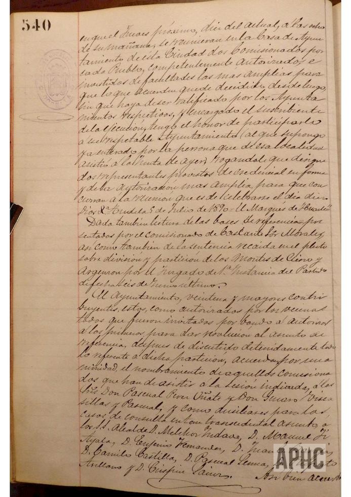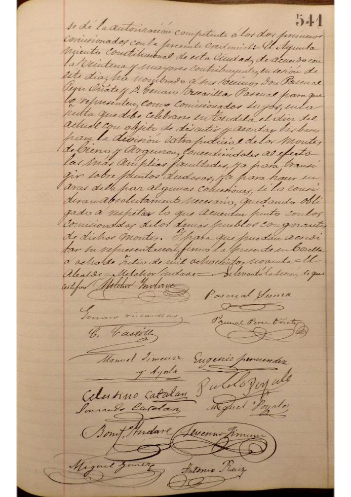 Reunidos Ayuntamiento, Veintena y Mayores Contribuyentes, se acuerda comisionar a Pascual Pérez Oñate y Genaro Viscasillas Pascual, para acudir a reunión en Tudela, sobre reparto de los Montes de Cierzo y Argenzón, para estudiar propuesta de Monteagudo, Murchante, Cascante y otras poblaciones.
