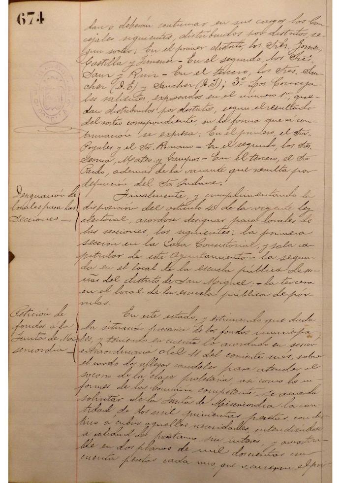 De conformidad con la legislación vigente, se acuerda el cese de los Concejales salientes Sres. Poyales, Romano, Campos, Pardo, Sesma y Mateo. Deben continuar los Concejales y por los distritos que se indican: Para el 1º Distrito, Sres. Gómez, Castilla y Jiménez; en el 2º, Sres. Sanz y Ruiz; en el 3º, Sres. Eusebio Sánchez y Julián Sánchez. Se designan los locales para las Secciones para las próximas elecciones municipales; la 1ª Sección en la Casa Consistorial, la 2ª en la escuela pública de niñas del distrito de San Miguel y la 3ª en la escuela pública de párvulos.
