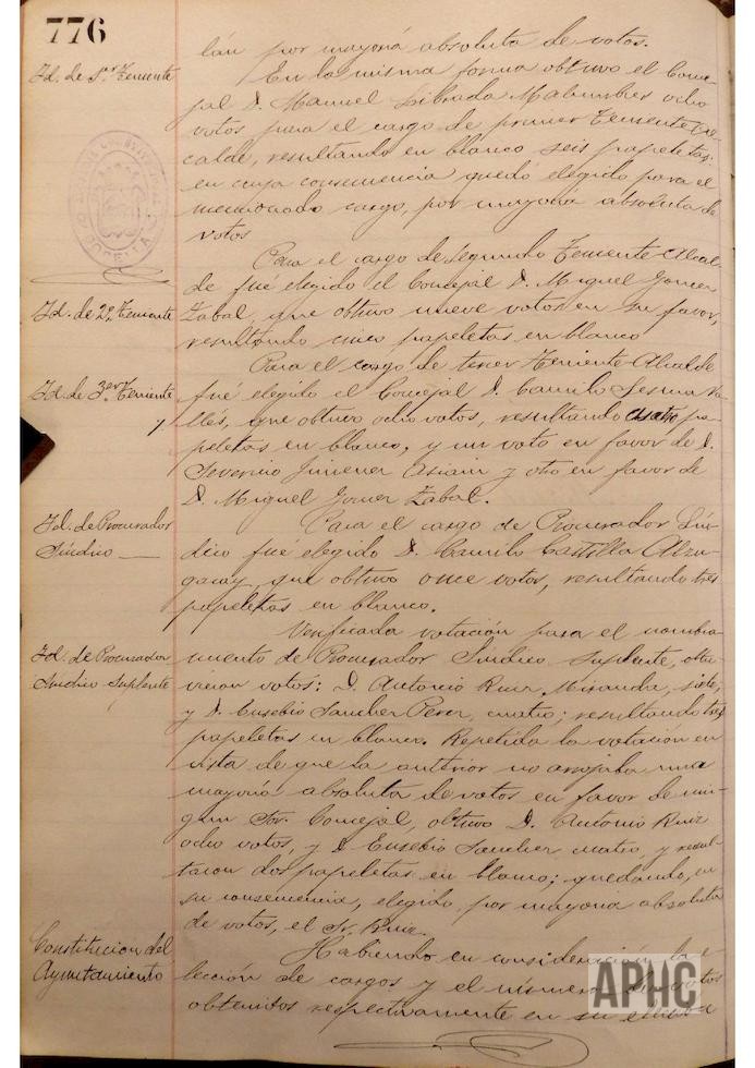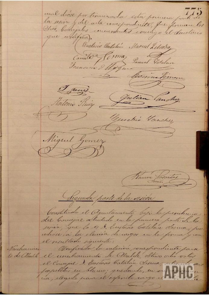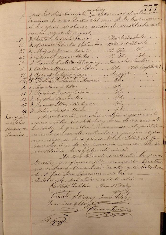 Realizadas las oportunas votaciones el Ayuntamiento queda constituido por: Alcalde, Eustasio Catalán Sesma; 1º Teniente alcalde, Manuel Librada Malumbres; 2º Teniente alcalde, Miguel Gómez Zabal; 3º Teniente alcalde, Camilo Sesma Vallés; Procurador Síndico, Camilo Castilla Alzugaray; Procurador Síndico suplente, Antonio Ruiz Miranda, y como Concejales, Pascual Catalán Sanz, José Sanz Igúzquiza, Silvestre Fernández Monreal, León Pascual Villar, Severino Jiménez Asiain, Eusebio Sánchez Pérez, Francisco Olloqui Rodríguez y Julián Sánchez Arigita. Las sesiones ordinarias se celebran los sábados a las 6 de la tarde.