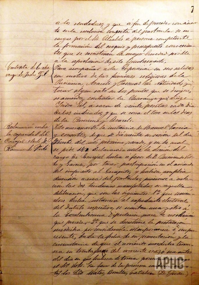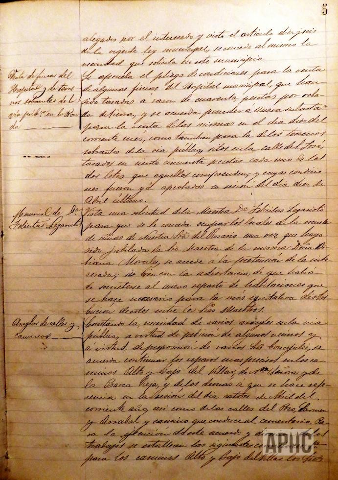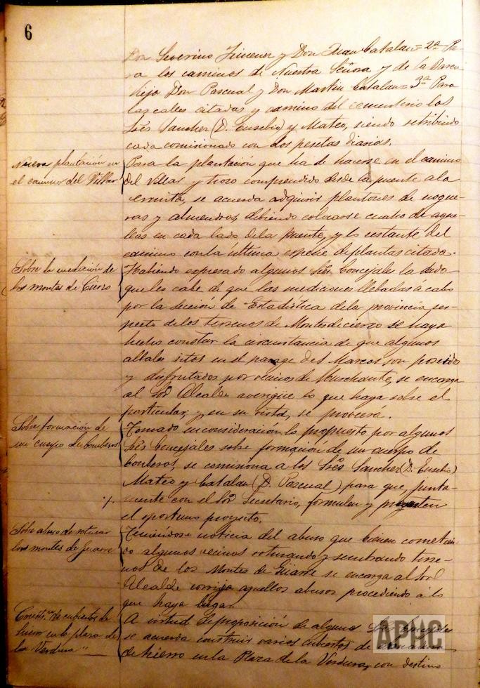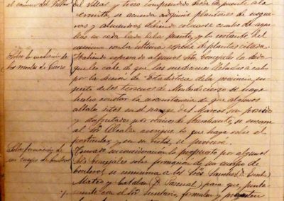 Se acuerda realizar una plantación de nogueras y almendros, desde la puente a la Ermita, en el Camino Bajo del Villar. Tomada en consideración la propuesta de creación de un cuerpo de bomberos, se comisiona a varios concejales y al secretario para que redacten el proyecto o reglamento.