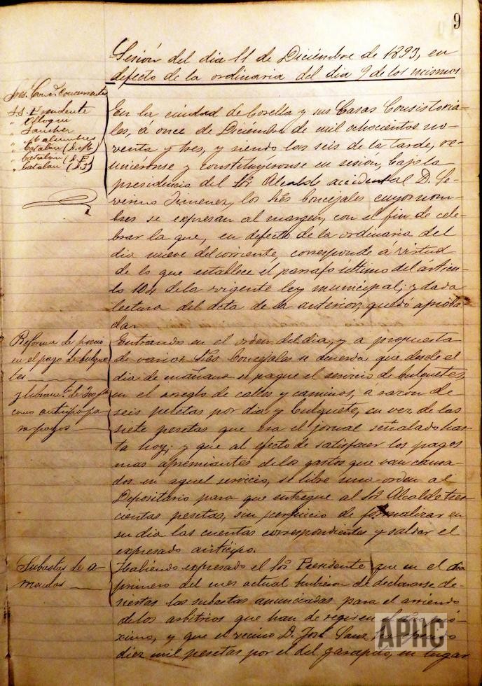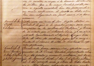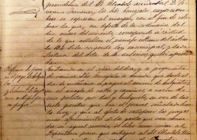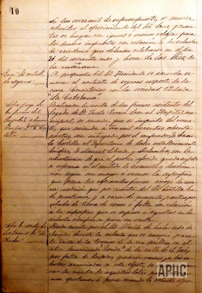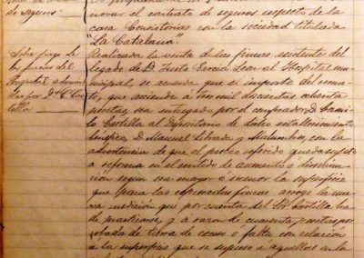 Se acuerda la renovación del contrato de seguro de la Casa Consistorial, con la sociedad “La Catalana”. (Entiendo puede referirse al seguro de incendios). Se deja constancia de que Camilo Castilla, ha comprado en pública subasta las fincas del Hospital Municipal, correspondientes al legado que realizó Justo García León, en la cantidad de 3.280 pesetas. Vista la solicitud de la Madre Priora del convento de Araceli, se acuerda la colocación en la fachada de dicha Iglesia, de un farol del alumbrado público.