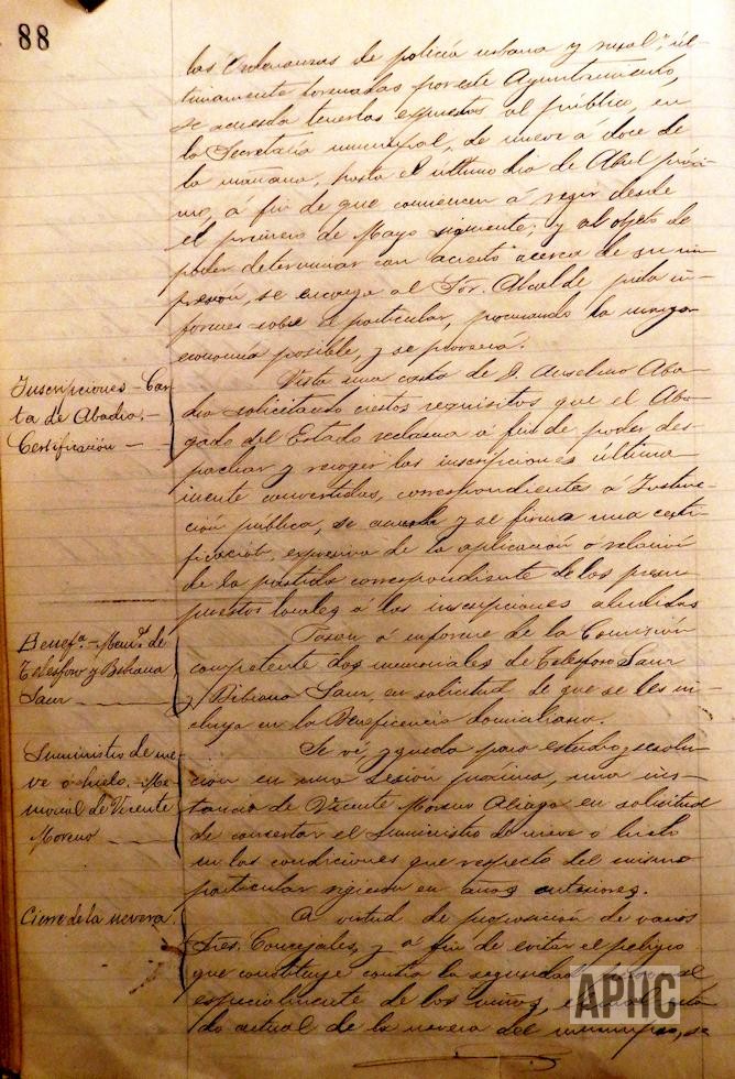 Se realiza la aprobación de las nuevas Ordenanzas de Policía Urbana y se dispone su publicación. Se informa sobre proposición de Vicente Moreno Aliaga, para contratación del suministro de hielo y nieve como en años anteriores, y se acuerda aplazar para otra sesión. Por el peligro que puede suponer para las personas, la nevera municipal, por su estado actual, se acuerda se cierre con obra de albañilería la puerta y “boquetes” que tiene. Se modifica la celebración de las sesiones municipales, trasladándose hasta nuevo acuerdo, a los sábados a las 6 de la tarde.