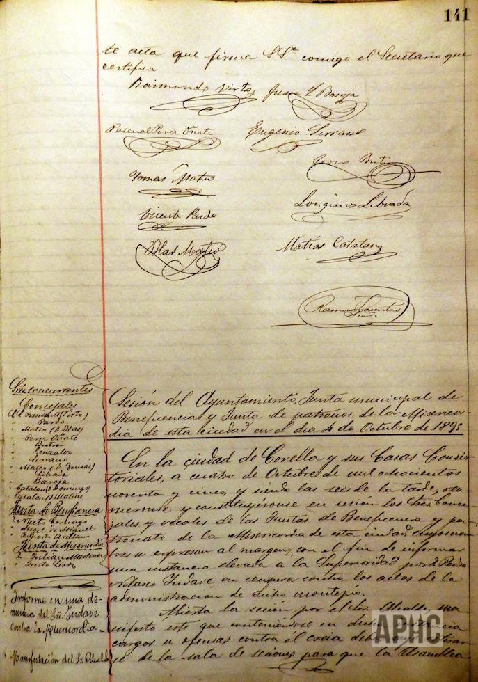 Reunidos Ayuntamiento, Junta Municipal de Beneficencia y Junta de Patronos de la Misericordia, se procedió a tratar sobre escrito denuncia de Pedro Nolasco Indave, contra la Misericordia, y una vez ausentados el Sr. Alcalde y Sr. Indave, se trató el tema, y por los asistentes se aprobó y firmó un informe sobre las falsedades expresadas por el Sr. Indave, así como la extraña publicación realizada en “El Liberal Navarro”, donde no son ciertas las afirmaciones de cargos de personas nombradas, teniendo presente el daño causado a dichas personas y al Patronato.
