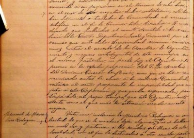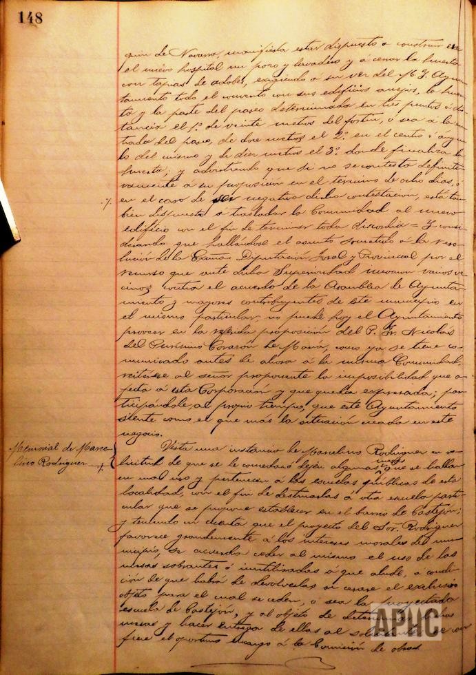 Se informa de comunicación de Fray Nicolás del Purísimo Corazón de María en que con poder bastante del P. Provincial de los Carmelitas Descalzos, Misioneros de Ultramar de la Provincia de San Joaquín de Navarra, en que manifiesta estar dispuesto a realizar las obras del pozo y lavadero, así como cerramiento de la huerta del nuevo edificio destinado a Hospital, por la permuta con los terrenos de El Carmen, haciendo referencia expresa del convento, edificios anejos, huerta y parte del paseo determinado en 3 puntos, y requiriendo una rápida contestación del Ayuntamiento y en caso contrario pasarían a instalarse en el nuevo edificio la Comunidad de Carmelitas. Se acuerda contestar que este Ayuntamiento no puede autorizar dicha permuta ya que al ser recurridos los acuerdos municipales ante la Excma. Diputación Foral de Navarra, se está a lo que dicha superioridad dictamine. Vista instancia de Marcelino Rodríguez, solicitando mesas que no se utilicen en las escuelas, para una escuela particular que desea establecer en Castejón, considerando que dicho proyecto es favorable al Municipio, se acuerda ceder las mesas sobrantes a que se refiere con la condición de su devolución si el proyecto no llega a formalizarse y se pasa dicho encargo a la Comisión de Obras. (Se entregarían 4 mesas).
