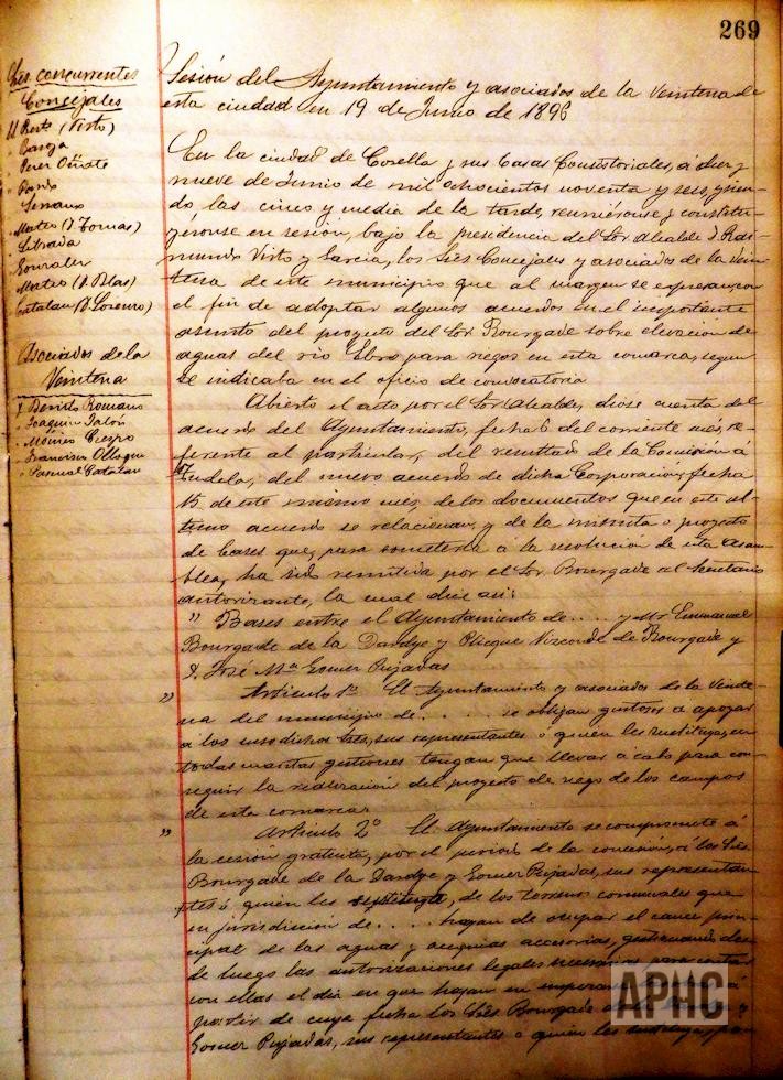 Reunidos Ayuntamiento y Asociados de la Veintena, se informa y trata sobre el proyecto de Enmanuel Bourgade de la Dardye y Plieque vizconde de Bourgade y José Mª Gómez Pujadas, para elevación de las aguas del río Ebro para riego de los campos de esta jurisdicción, y las bases del condicionado que proponen para construcción y explotación de dicho proyecto, y se acuerda realizar una mayor información y someterlo a la aprobación de la Diputación Foral. En sesión del día 25, se aprueban las bases para dicho proyecto.