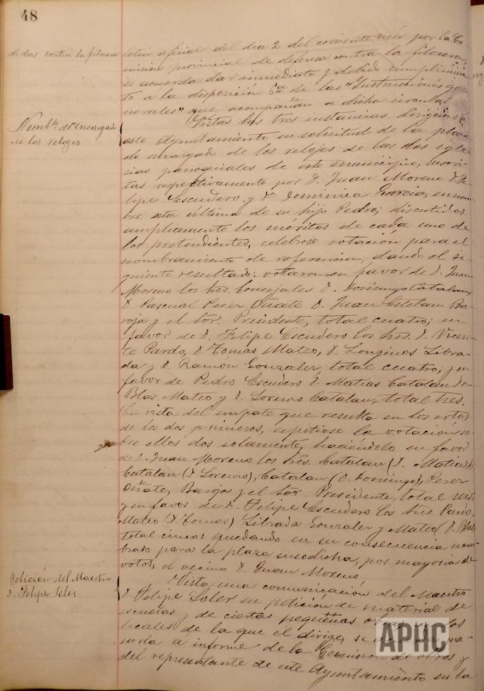 Previa votación entre los solicitantes, resultó nombrado encargado de los relojes de ambas Parroquias, Juan Moreno.