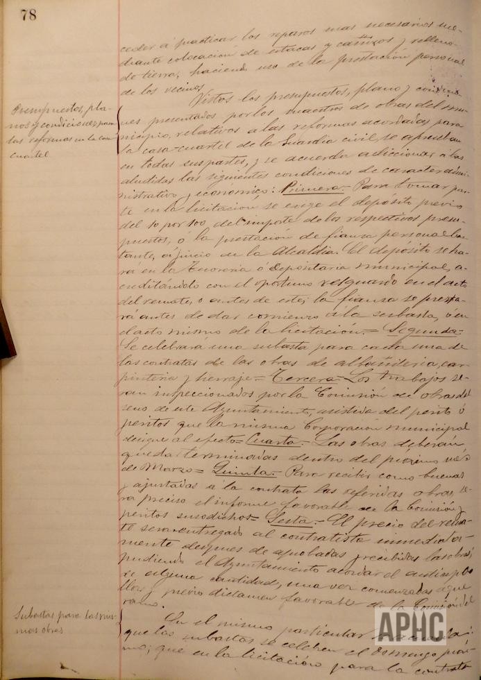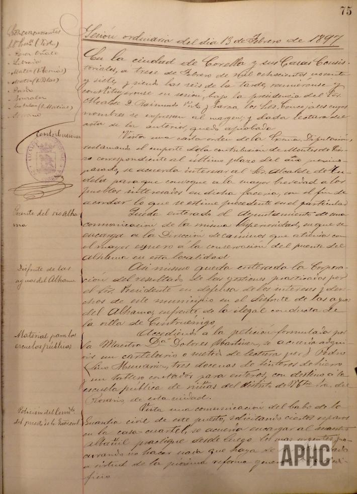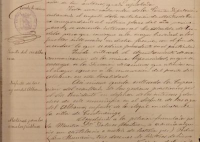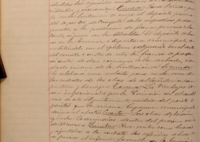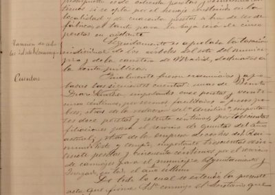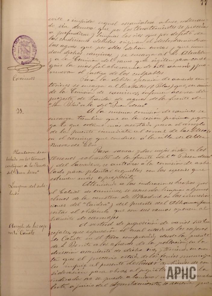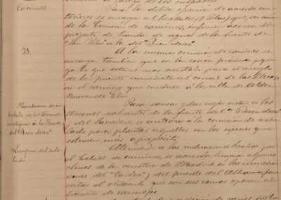 Se acuerda la realización de alguna reforma en el matadero público, por algunos “tollos” del río Ampol, que originan filtraciones de agua en dicho edificio. Se accede a petición del capellán de la iglesia de Ntra. Sr. de la Merced, Hipólito Cazcarro, concediendo la cantidad de 25 pesetas, para el arreglo del reloj de la torre de dicha iglesia, en función del servicio que presta a los vecinos. Se encarga al Concejal Blas Mateo que, en unión de la Comisión de Caminos, informe acerca del proyecto de traída de aguas de la fuente de San Blas a la del Buen Deseo. Se autoriza a la Comisión de Caminos, la plantación de arbolado en la fuente del Buen Deseo y en el Lavadero. Se acuerda sacar a pública subasta la reforma de la Casa-Cuartel de la Guardia Civil.