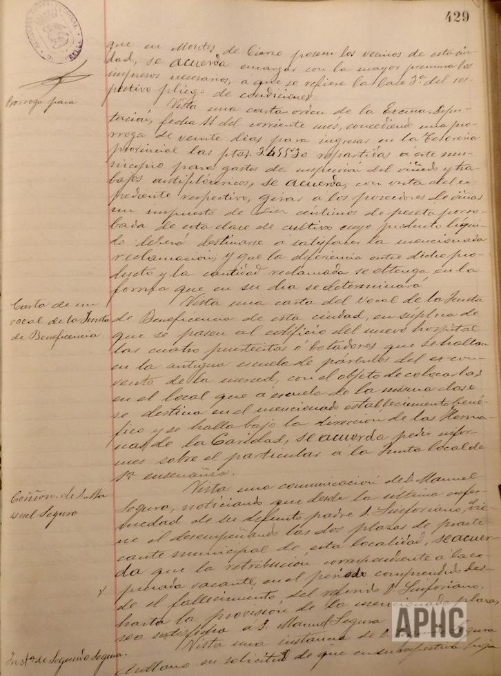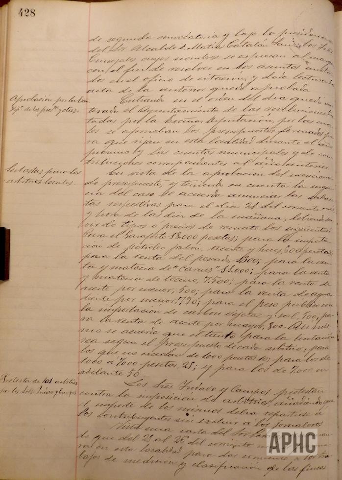 Queda enterado el Ayuntamiento de la aprobación por la Excma. Diputación del presupuesto para el próximo año y de las cuentas municipales y de contribuciones del año anterior. Se acuerda anunciar las correspondientes subastas para los arbitrios locales, debiendo servir de tipos o precios de remate los siguientes: Para el Garapito, 18.000 pesetas; para la importación de petróleo, jabón, aceite y heces, 600 ptas.; para la venta de pescado, 1.300 ptas.; para la venta de matanza y carnes, 11.000 ptas.; para la venta y matanza de tocino, 7.500 ptas.; para la venta de aceite al por menor, 500 ptas.; para la venta de aguardiente al por menor, 750 ptas.; para el peso público con importación de carbón vegetal y sal, 500 ptas.; para la venta de aceite por mayor, 800 ptas.. Los Concejales Sres. Indave y Campos, protestan contra la imposición de arbitrios, indicando que su importe debía repartirse a los contribuyentes, sin excluir a los jornaleros.