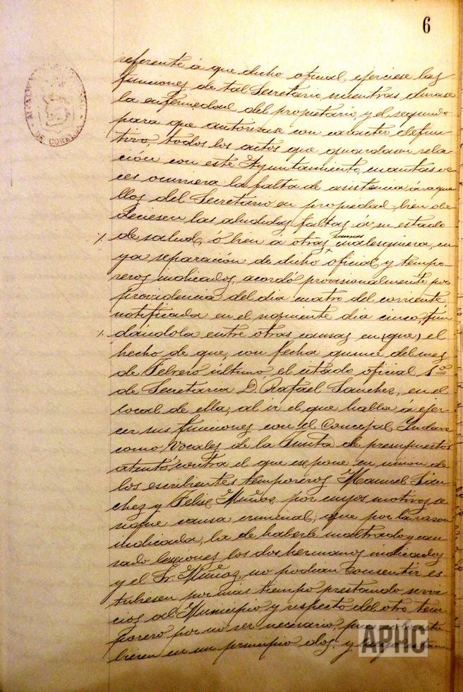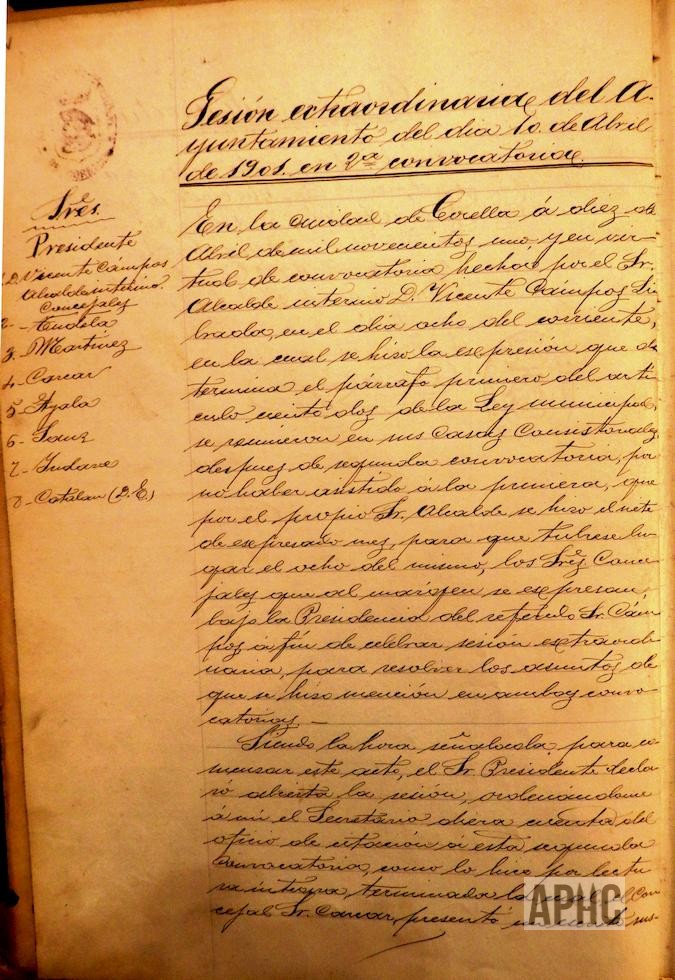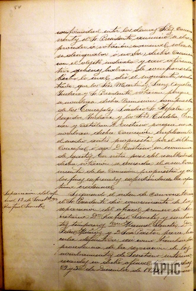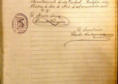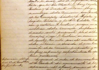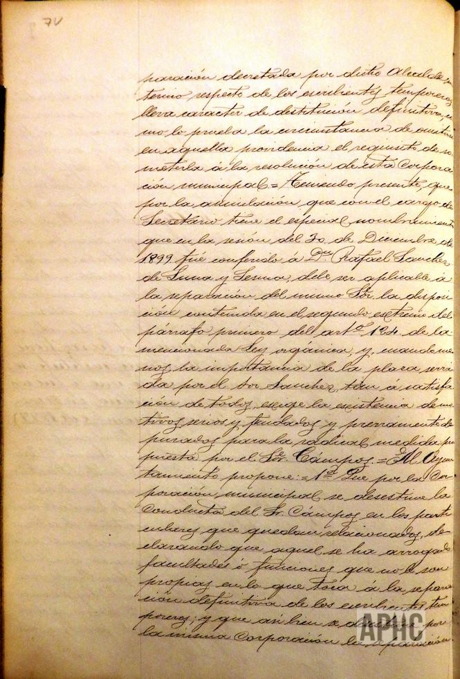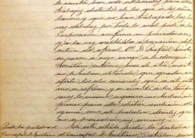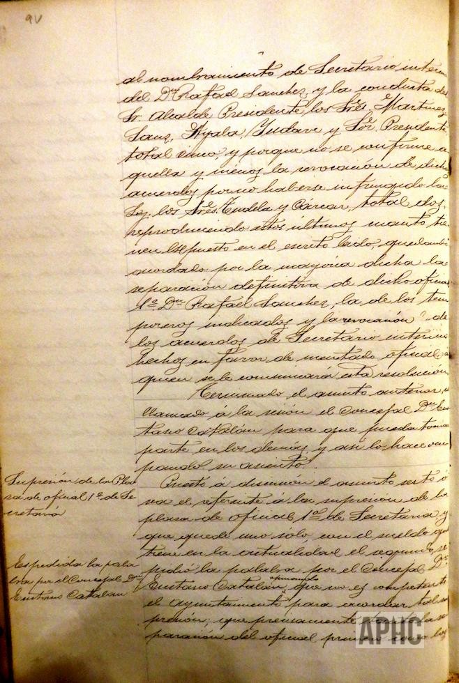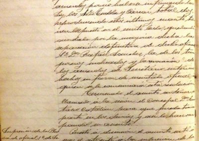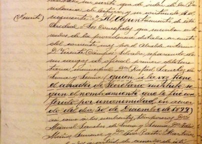 Por los hechos expresados en acta, se realiza la toma de posesión como Alcalde interino por parte del Concejal Vicente Campos Librada. Asimismo y a propuesta del Alcalde Sr. Campos, mediante la oportuna votación y por mayoría de votos, se acuerda la separación definitiva de Rafael Sánchez de Luna Sesma, como oficial 1º de Secretaría y Secretario sustituto, y de los escribientes temporeros Manuel Sánchez de Luna Sesma, Félix Muñoz Jiménez y José Pastor Martínez. Asimismo y a propuesta del Alcalde Sr. Campos, mediante la oportuna votación y por mayoría de votos, se acuerda la separación definitiva de Rafael Sánchez de Luna Sesma, como oficial 1º de Secretaría y Secretario sustituto, y de los escribientes temporeros Manuel Sánchez de Luna Sesma, Félix Muñoz Jiménez y José Pastor Martínez.