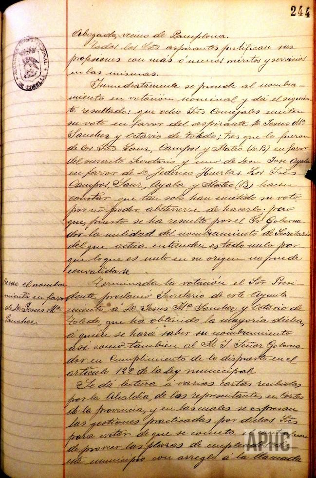 Por los hechos que constan en acta, se acuerda el nombramiento para el cargo de Secretario Municipal, a favor de Jesús Mª Sánchez Octavio de Toledo.