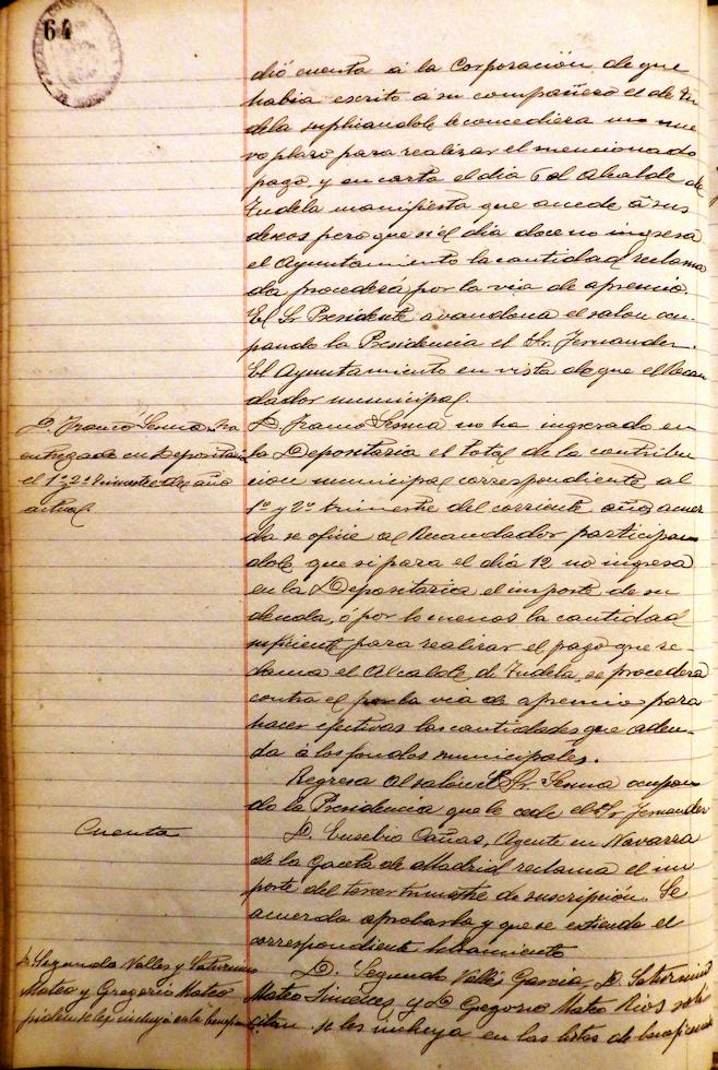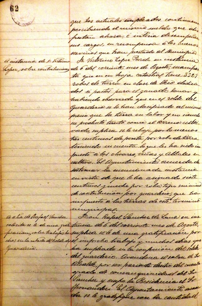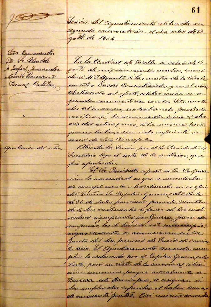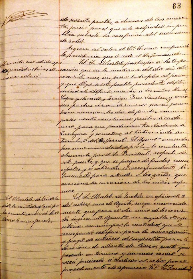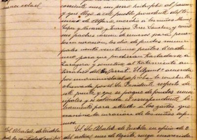 Cumpliendo con lo ordenado por el Capitán General del Norte, respecto a vacantes anunciadas en la Gaceta de Madrid, para individuos significados de guerra, vista la precaria situación económica de este Municipio, se acuerda que a dichos empleados se les asigne un haber o sueldo anual de 50 pesetas y que los empleados actuales continúan con el sueldo y cargo que actualmente ocupan.(Parece se trata de un recurso promovido por un inoportuno o malicioso anuncio del anterior alcalde Pedro Nolasco Indave Lapeña, sobre ciertas vacantes de cargos municipales inexistentes y sobre las que el Capital General del Norte, máxima autoridad militar de la zona, podría intervenir en la designación de dichos cargos públicos en este Ayuntamiento. En Navarra, tanto por los Ayuntamientos como por la Diputación, esta intervención de dicha autoridad militar se consideró un contra Fuero, pues cercenaba los derechos que tenía Navarra, en estos nombramientos. Los Ayuntamientos y la Diputación Foral de Navarra, estuvieron pleiteando con el Estado sobre asunto, que, de momento se solucionaba de este provisional modo, asignándoles una asignación económica pero que no tomasen posesión del cargo. Al final prevalecieron los derechos de Navarra). Por el Alcalde, se informa de que el pasado día 6, un perro hidrófobo, procedente del término de Alfaro, mordió a los niños Manuel López Navarro y Enrique Pérez Sánchez, y que como sus padres carecen de recursos para su curación, les dio de fondos municipales, la cantidad de 125 pesetas a cada familia, para que pudieran trasladarse a Zaragoza y someterse a un tratamiento antirrábico. El Ayuntamiento aprueba y acuerda la conducta del Alcalde y que se atiendan los gastos que ocasione la curación de estos niños, de los fondos municipales.