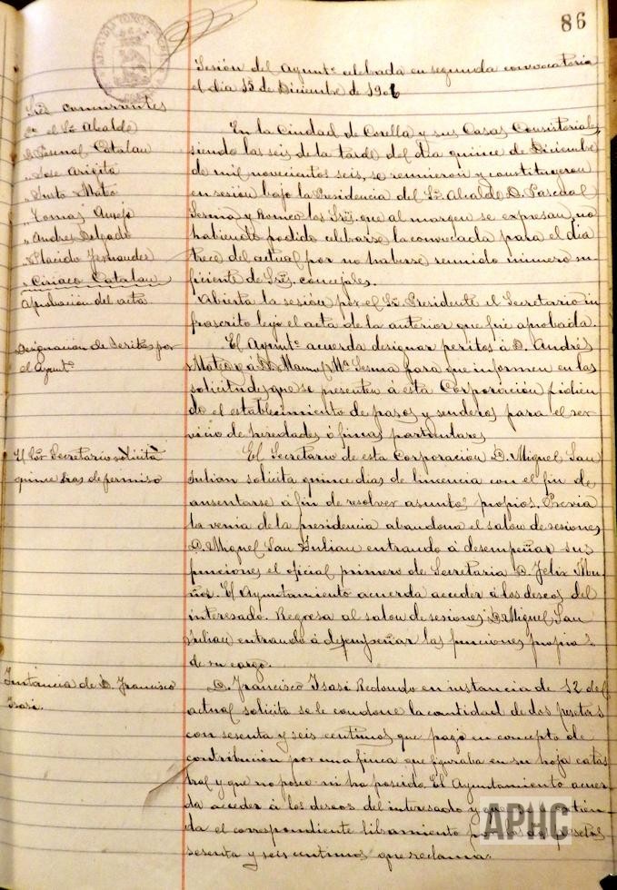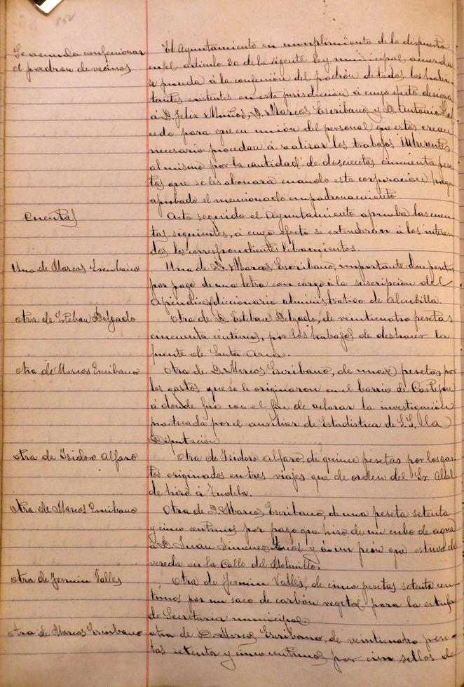 Se acuerda proceder a la confección del Padrón de Habitantes. Se aprueba una cuenta de Esteban Delgado (cantero), de 28 pesetas, por los trabajos de “deshacer la fuente de Santa Ana”. La Fuente se desmontó para la construcción de la carretera a la estación del Ferrocarril y se trasladó a un lugar muy próximo en la carretera a Tudela.