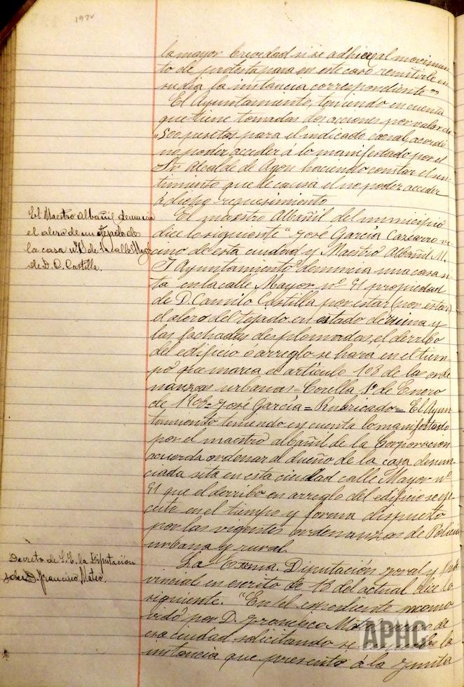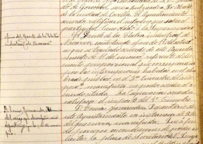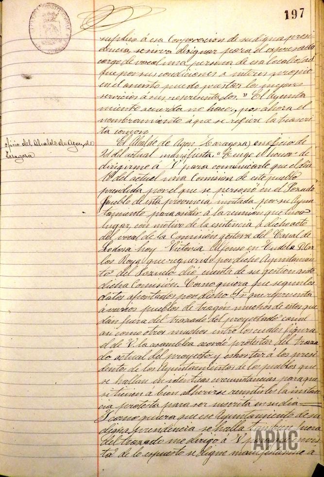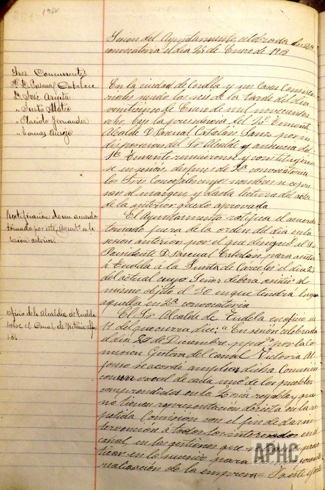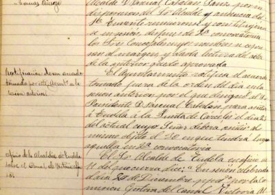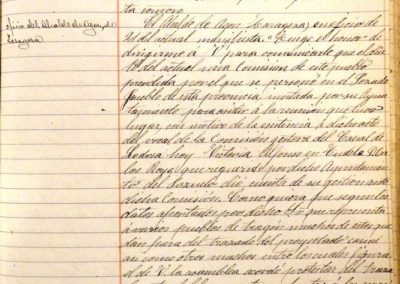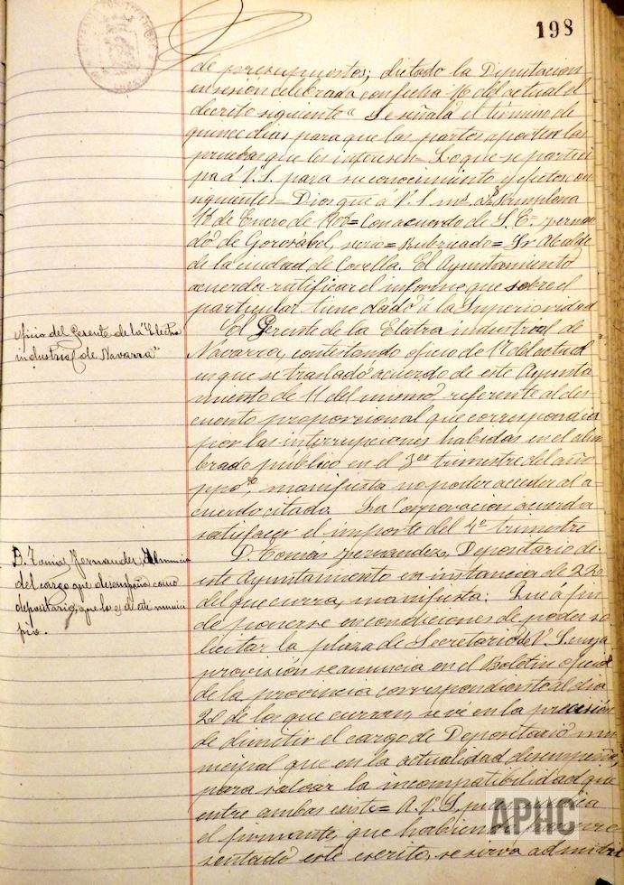 El Ayuntamiento de Tudela, solicita se nombre un representante de este Ayuntamiento como Vocal, para la l Gestora del Canal Victoria-Alfonso (posterior Canal de Lodosa). El Ayuntamiento acuerda no proceder, por ahora, a dicho nombramiento. El Ayuntamiento de Agón (Zaragoza), informa sobre que dicha localidad queda fuera del trazado del Canal Victoria-Alfonso, y como Corella también queda fuera de dicho trazado, solicitado el apoyo para formular protesta por localidades que estén afectadas; el Ayuntamiento acuerdo contestar que no puede acceder a dicho requerimiento. El Depositario del Ayuntamiento, Tomás Fernández Virto de Vera, presenta su renuncia al dicho cargo, ante la incompatibilidad existente, ya que se presentará a la provisión de la plaza de Secretario del Ayuntamiento, anunciada en el Boletín Oficial de la Provincia. El Ayuntamiento admite dicha renuncia. Se acuerda nombrar Depositario interino a Franco Sesma Chivite, por estar dicha plaza vacante ante la renuncia de Tomás Fernández Virto de Vera.
