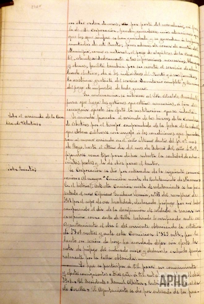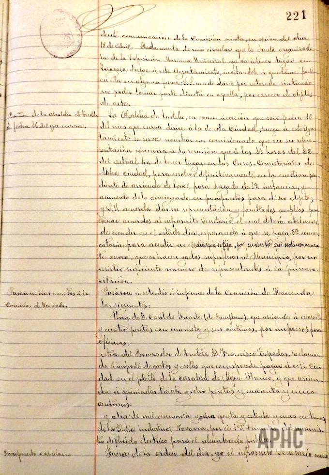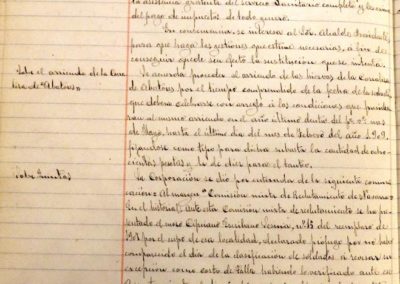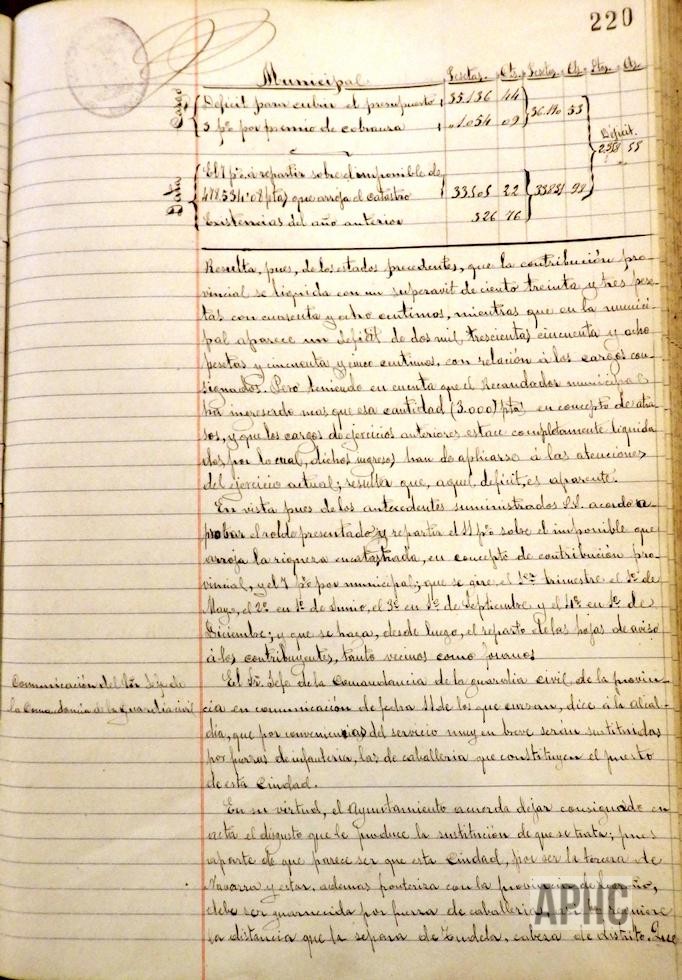 Se aprueba el rolde de las Contribuciones para al año actual. La Comandancia de la Guardia Civil, comunica que, en breve, las fuerzas de Caballería serían sustituidas por fuerza de Infantería, del puesto de la Ciudad. El Ayuntamiento manifiesta el disgusto que le produce dicha sustitución, teniendo presente que esta Ciudad es la tercera de Navarra y estar frontera con Logroño, debe ser guarnecida por fuerza de Caballería y que este Ayuntamiento corre con los gastos de edificio y su mantenimiento, alimentación de los caballos, asistencia gratuita de asistencia sanitaria a los individuos del puesto y sus familias; por lo cual se solicita al Alcalde realice las gestiones oportunas para que no se produzca dicho relevo. Entre otras facturas, se aprueba una de la compañía Electra Industrial Navarra, por importe de 1.058,75 pesetas, por suministro de fluido eléctrico para al alumbrado público, correspondiente al primer trimestre.