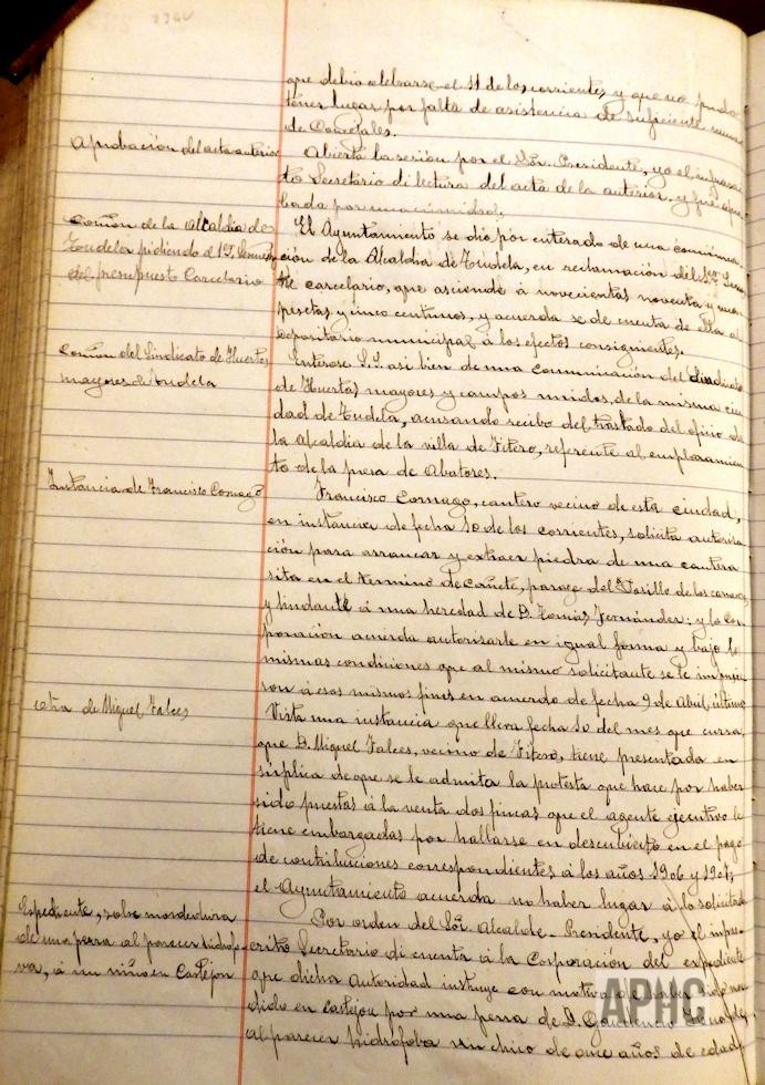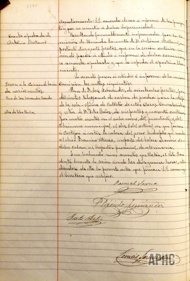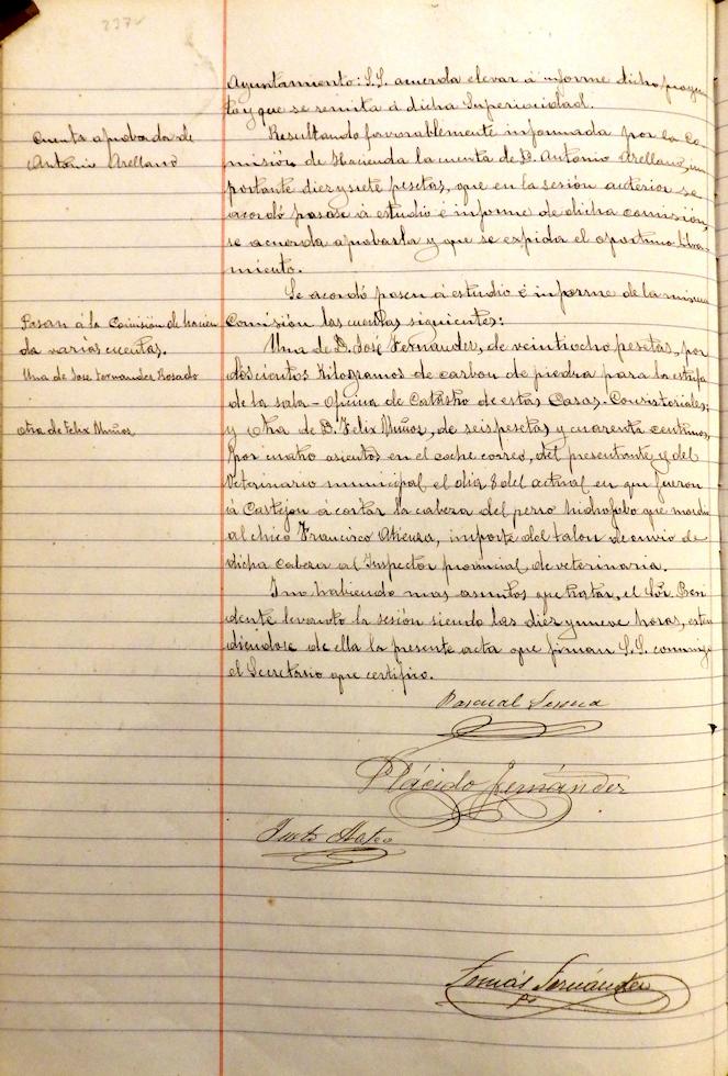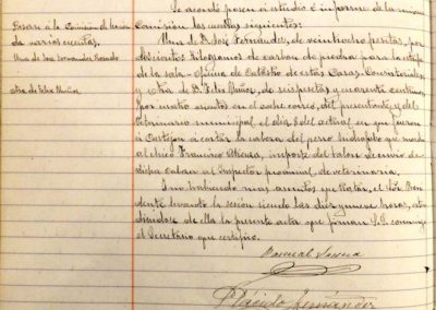 Se informa sobre medidas adoptadas respecto a la mordedura producida por una perra hidrófoba de Gaudencio Hualde, al chico de 11 años Francisco Atienza Romano, en Castejón. Se aprueba una cuenta por gastos de Veterinario en su desplazamiento a Castejón para sacrificar a la perra, portadora de rabia, que mordió al chico Francisco Atienza.