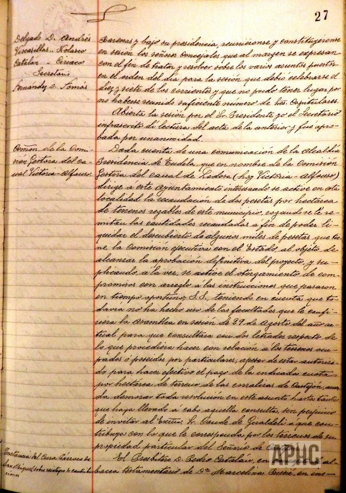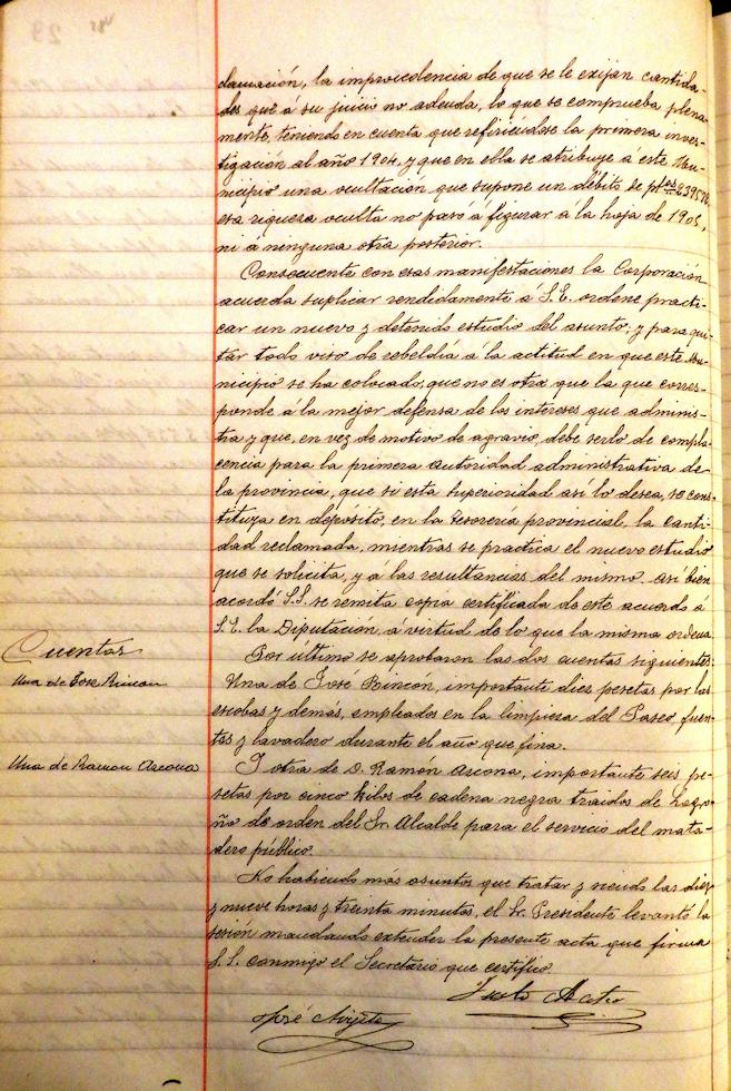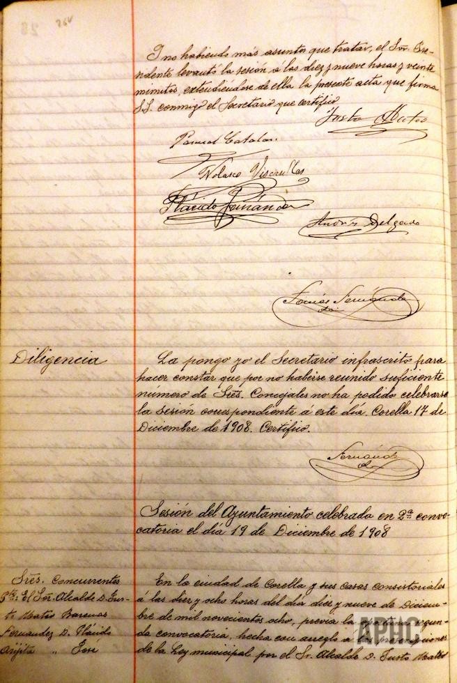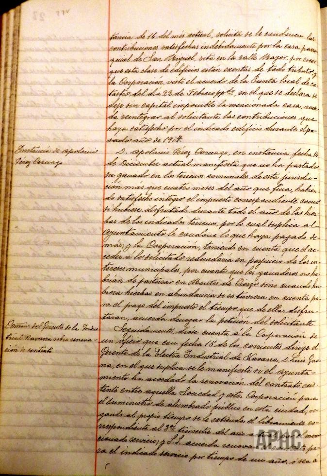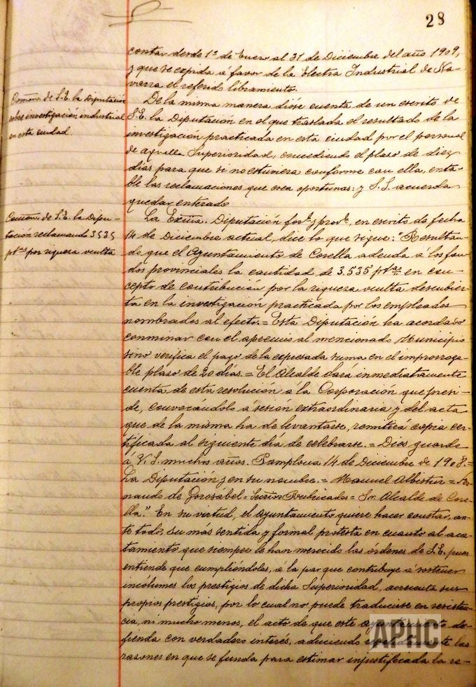 El Cura-Párroco de San Miguel, Pedro Catalán, como albacea testamentario de Marcelina Bisié, solicita la devolución de la contribución pagada por la casa parroquial de San Miguel, situada en la calle Mayor y de conformidad con lo acordado por la Junta Local de Catastro, se acuerda la devolución de lo abonado en el año 1907. (Marcelina Bisié, junto a otros relevantes bienes, había donado esta casa de la calle Mayor, 44, para vivienda de los sacerdotes de la Parroquia de San Miguel). Se acuerda la renovación del contrato para el suministro eléctrico público con la empresa Electra Industrial de Navarra, por el periodo comprendido entre el 1 y el 31 de Diciembre de 1909.
