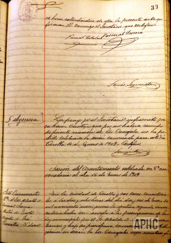 En un informe, se indica que el Hospital Municipal de Corella, es uno de los mejores de la Provincia bajo cualquier punto de vista que se considere, excelentemente atendido por cinco Hermanas de la Caridad y un Capellán-Administrador, nombrado por este Ayuntamiento, al que rinde cuentas cada año y siempre que se le piden. También se indica que el número de estancias, incluso en el año 1908, ha sido por término medio de 6.000. Se formaliza contrato con la Banda de Música que dirige Telesforo Salcedo, para las actuaciones musicales del presenta año.