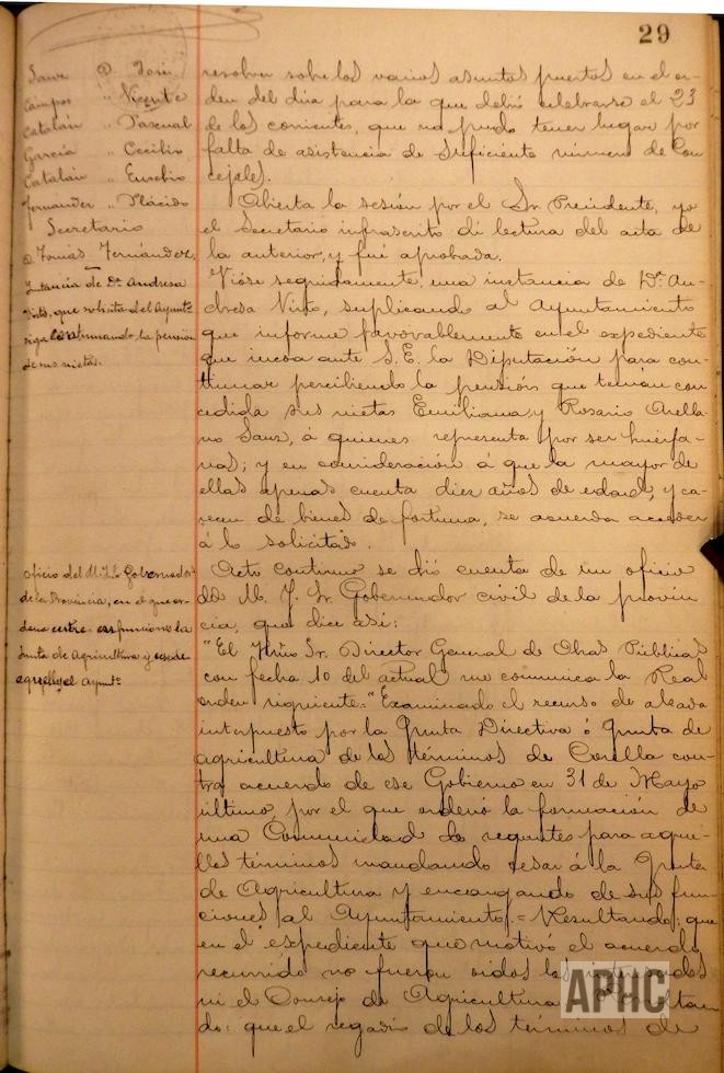 Se informa de oficio del Gobernador Civil, restituyendo la Junta de Agricultura, para la organización del regadío de los términos municipales. (También la Junta de los Términos). Se hace constar la renuncia presentada por el Alcalde Dámaso Escudero, renuncia que no es admitida por los Concejales, a pesar de las consideraciones recogidas en dicha renuncia.