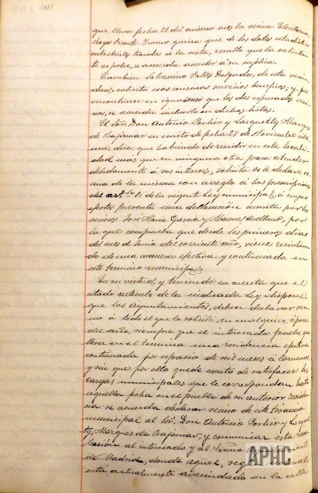 Previa solicitud, se acuerda conceder la vecindad a Antonio Porlier y Lasquetti, Marqués de Bajamar y comunicar esta resolución al interesado y al Ayuntamiento de Madrid, donde el interesado figura avecindado, en la calle Claudio Coello número 17. Vecindad que se concedió definitivamente, al solicitante, familia y servidumbre con fecha 18-01-1912, un vez cumplidos los requisitos oportunos. Previa solicitud del Director de la Banda Municipal, José Ausejo Arigita, se acuerda gratificar con 100 pesetas, a dicha Banda, por sus actuaciones en las pasadas fiestas patronales.