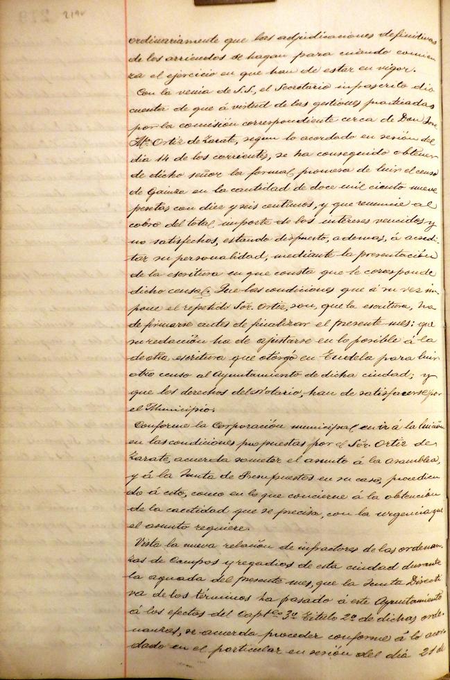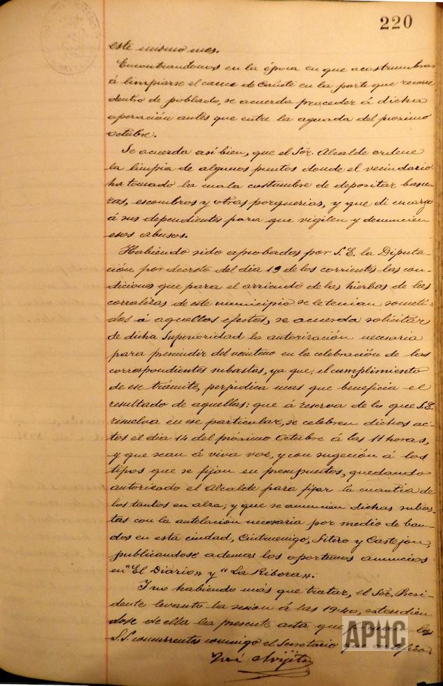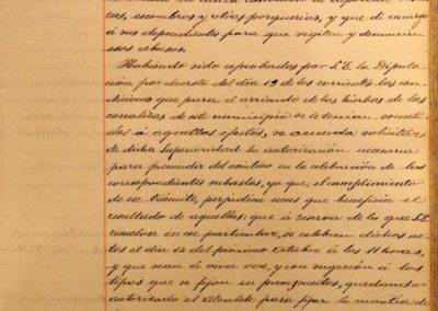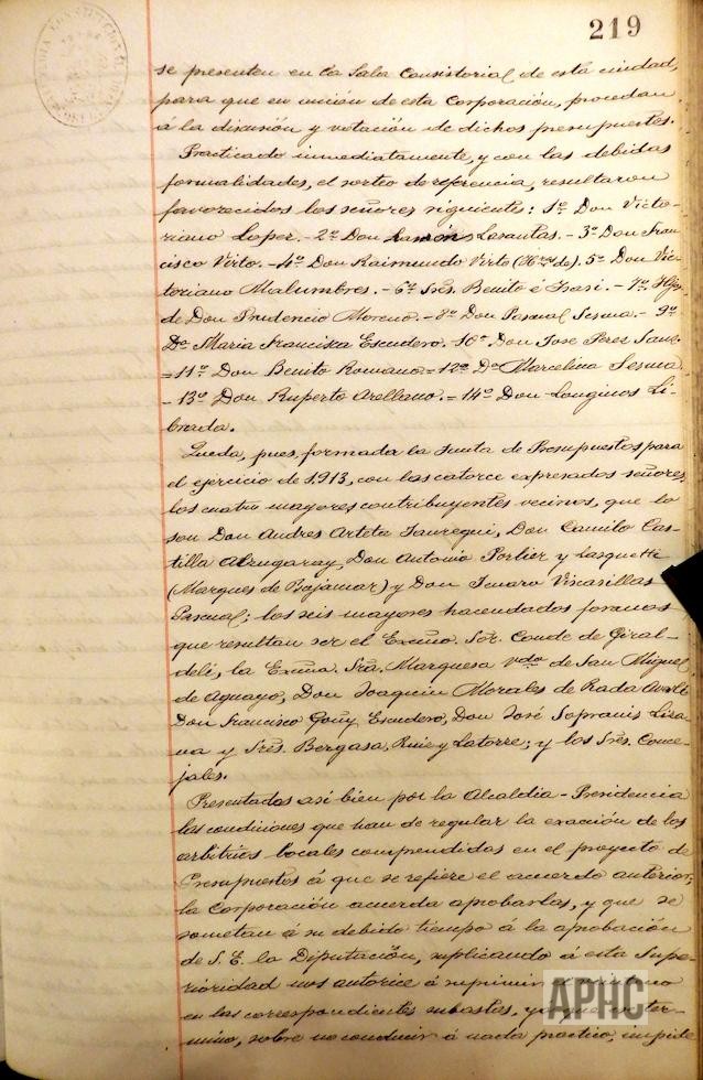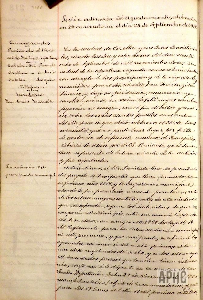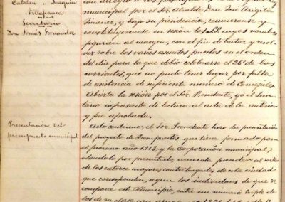 Presentado, por el Alcalde, el Presupuesto de Gastos e Ingresos municipal, para el próximo año de 1913, se procede al sorteo de los 24 miembros que, en unión de los miembros del Ayuntamiento, intervendrán en la revisión de dicho Presupuesto. Se aprobaron los arbitrios o impuestos municipales propuestos por la Alcaldía. Por estar en las fechas en que habitualmente se realiza, se acuerda proceder a la limpieza del cauce del río Cañete, en la parte que recorre dentro de la Población, antes de que entre la aguada del próximo Octubre.