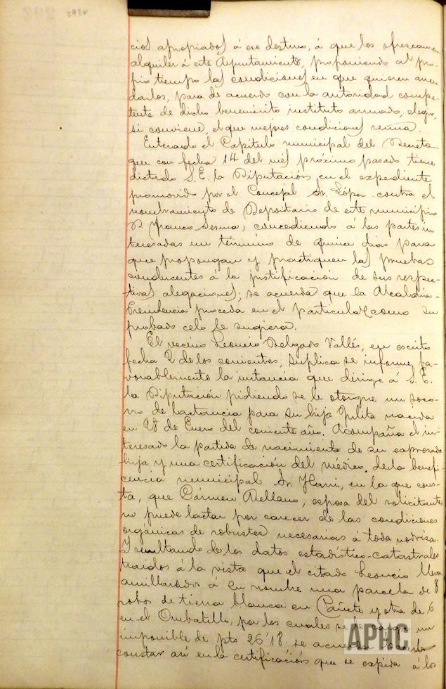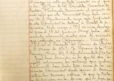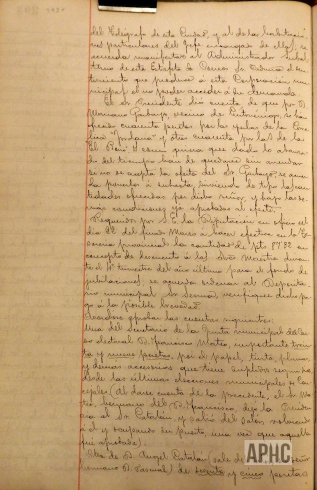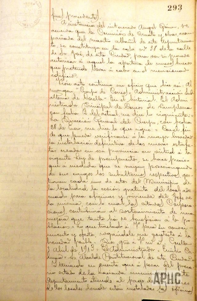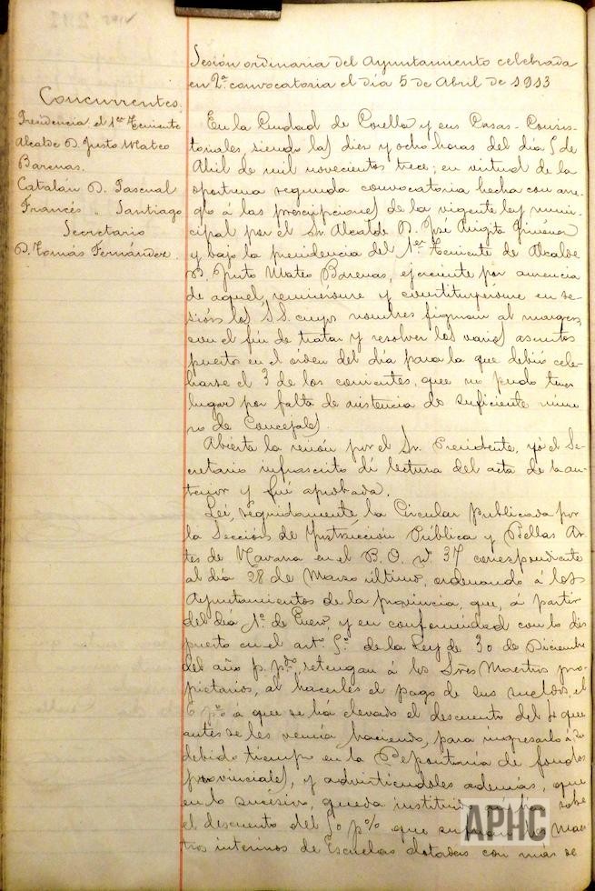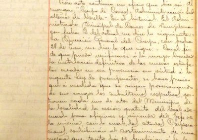 El Ayuntamiento se da por enterado de disposiciones relativas a retribuciones de los Maestros titulares e Interinos. El Prior de los Carmelitas Descalzos de Corella, (Fray Ignacio de la Virgen del Carmen) comunica que finalizado el arriendo formalizado con el Ayuntamiento, de una casa destinada a Cuartel de la Guardia Civil, sea desalojada para el día 12 del próximo mes de Mayo, abonando el arriendo de los 4 últimos años que adeuda la Corporación; se acuerda realizar gestiones ante dicho Prior para que deponga su actitud de intransigencia y que se publique bando para que quien tenga edificios apropiados para ese destino los ofrezcan al Ayuntamiento. El Administrador de Correos de Corella (Emilio Orduna), informa de comunicación de la Administración de Pamplona, en la que se indica que dichos empleados gestionarán con los respectivos Ayuntamientos la cesión gratuita del local adecuado para oficinas y vivienda del Jefe de la misma. El Ayuntamiento deja constancia de que ya viene atendiendo los alquileres de dichas oficinas y la de Telégrafos y manifestará al Administrador de la oficina de Corella, que le resulta imposible poder atender lo demandado.