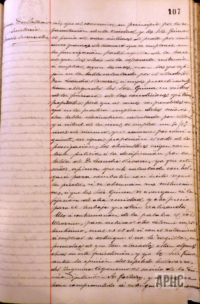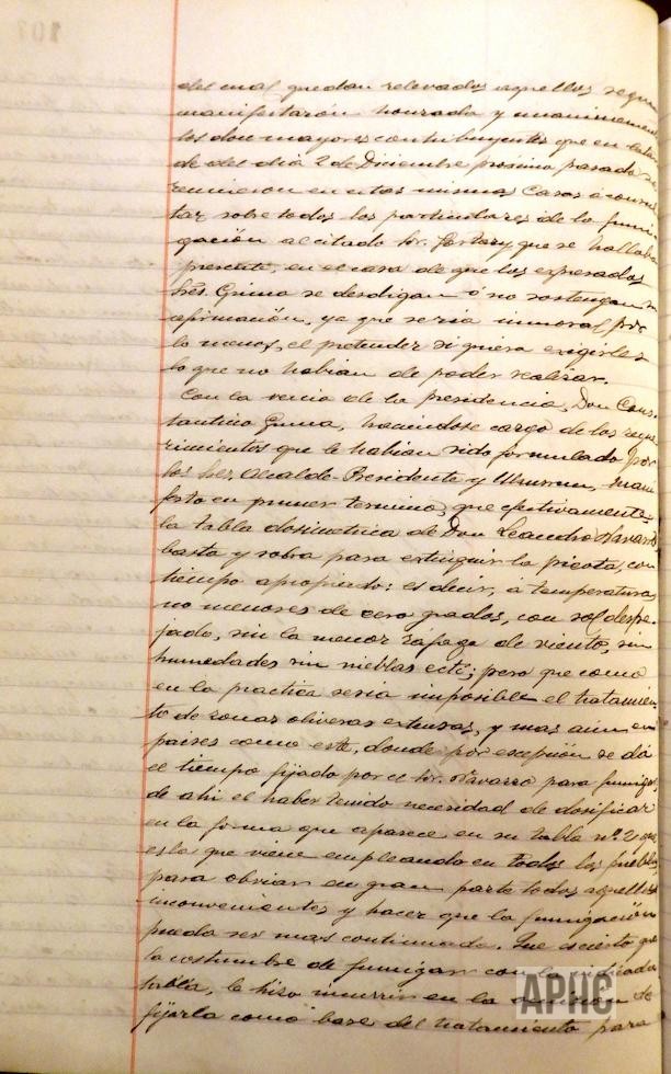 Nuevamente se informa y debate sobre el tratamiento por fumigación que están realizando los hermanos Constantino, Pío y Baltasar Grima de la sociedad “Grima Hermanos”, de Valencia, en cuanto a la dosificación del producto y la informada por Leandro Navarro, Director de la Estación Patológica Vegetal de Madrid, acordando conceder un plazo a los hermanos Grima, para que realicen una modificación satisfactoria en cuanto a la dosificación para realizar dicha fumigación.