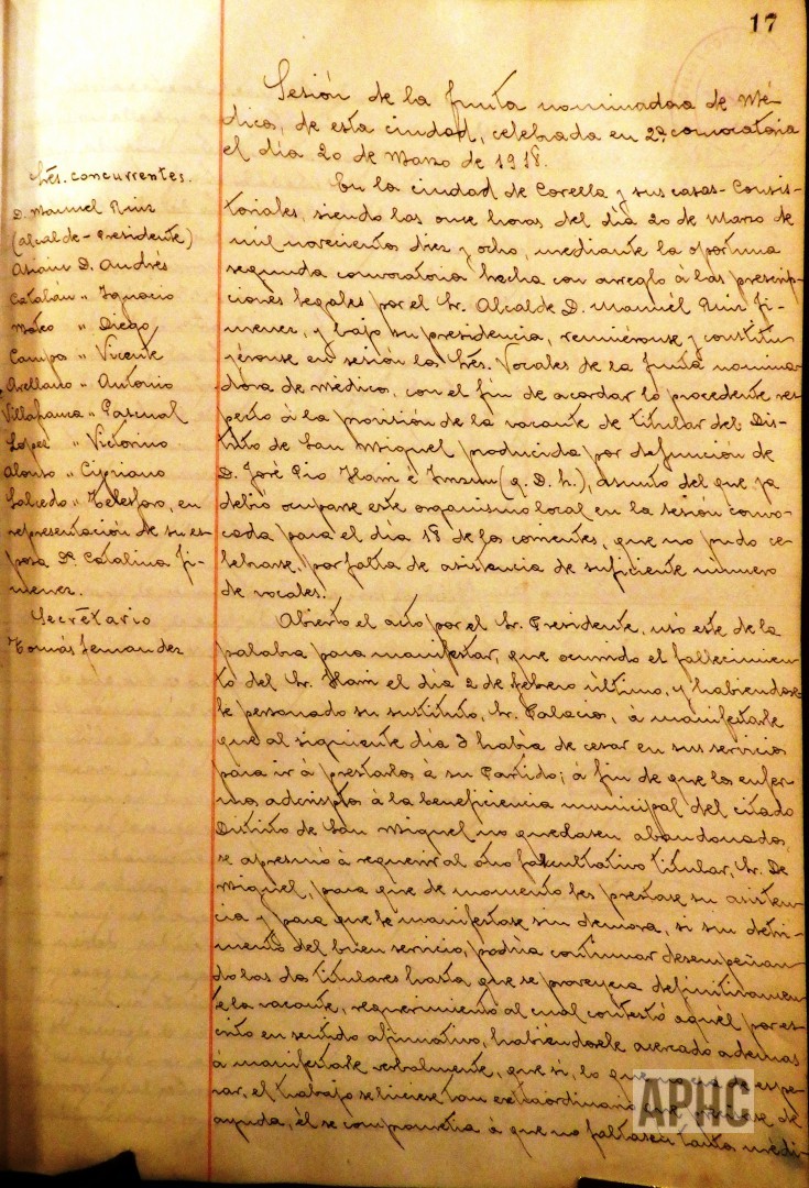 – El Alcalde expone que ocurrido el fallecimiento del Médico del Distrito de San Miguel, José Pío Ilarri Irurzun, el pasado día 2 de Febrero, se entrevistó con el Médico del Distrito del Rosario Ángel de Miguel Anocibar, quien manifestó se hacía cargo de ambos distritos hasta tanto se cubra dicha vacante. Se acuerda aprobar el proceder del Alcalde en este asunto y realizar las gestiones oportunas para que se cubra dicha vacante.