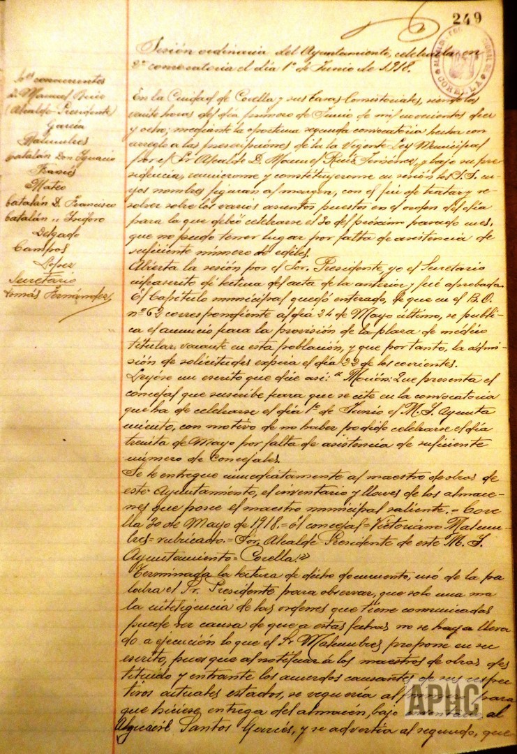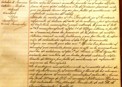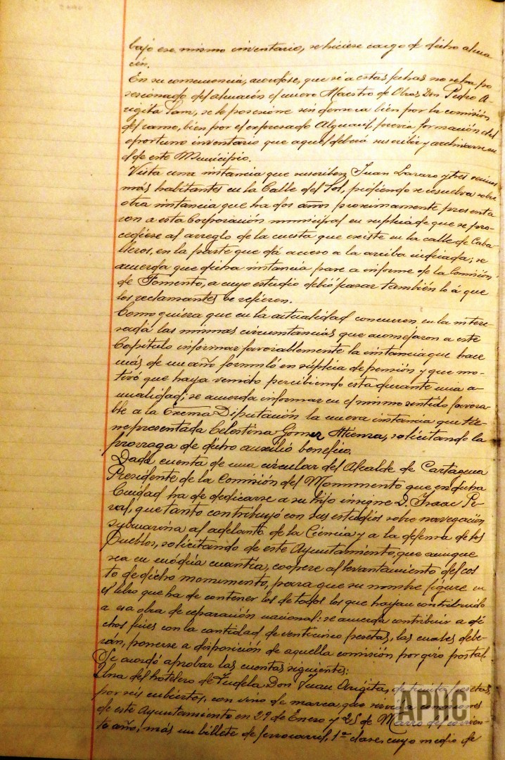 – Vista comunicación del Ayuntamiento de Cartagena, sobre erigir un monumento a Isaac Peral, por su contribución a la navegación submarina, se acuerda contribuir con 25 pesetas.
