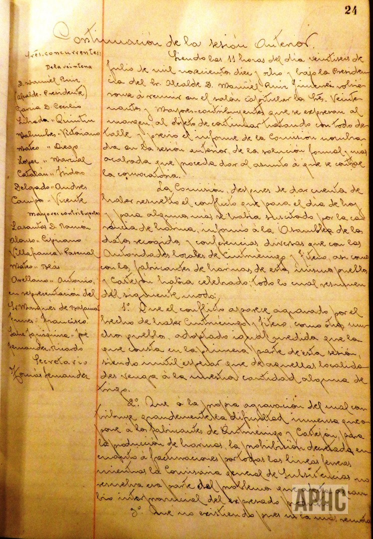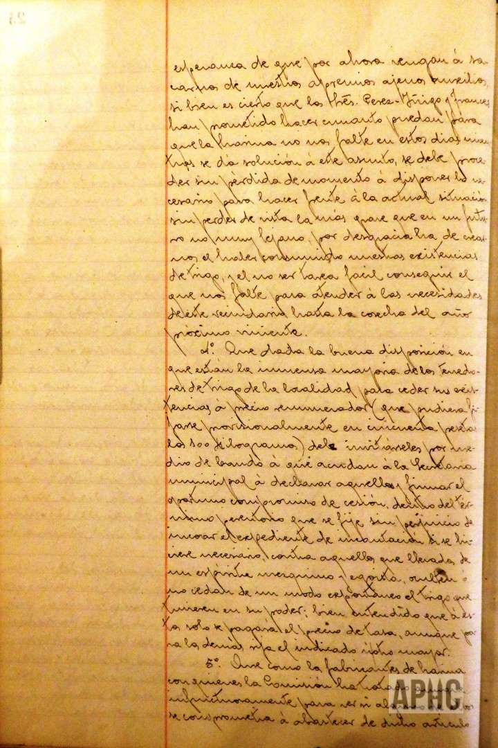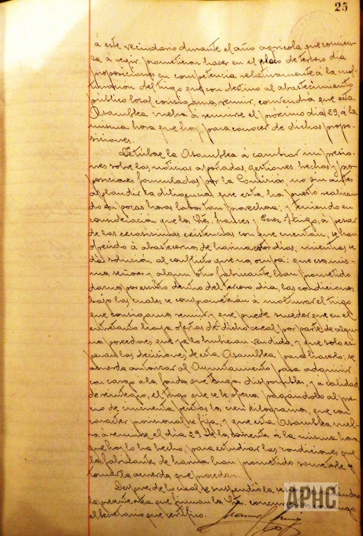 – La Comisión municipal nombrada en sesión anterior informa sobre las gestiones realizadas con los fabricantes de harina de Cintruénigo y Fitero y parece que están dispuesto a suministrar harina en tanto en cuanto no se resuelva la situación existentes y por parte de los agricultores de esta Ciudad, no existe problema en que cedan el trigo que tienen almacenado para su venta. No obstante hay que estar muy alerta sobre el desarrollo de la situación para evitar quedarse sin harina y no poder fabricar pan para alimentación.