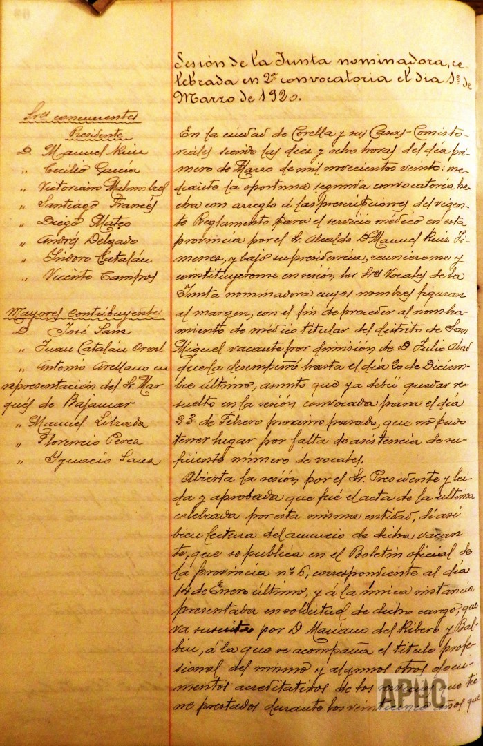 – Vista la instancia presentada para la vacante de Médico existente, se acuerda nombrar Médico de la Beneficencia para el Distrito de San Miguel a Mariano del Ribero Balbín, con una dotación anual de 1.750 pesetas, pagaderas por trimestres vencidos y bajo las obligaciones indicadas en el vigente Reglamento para esta Navarra.